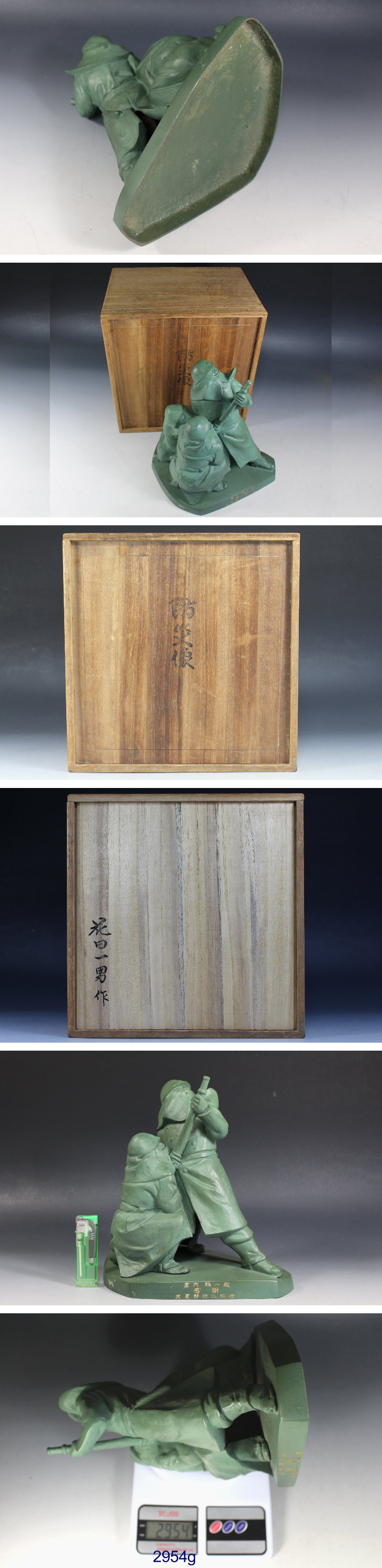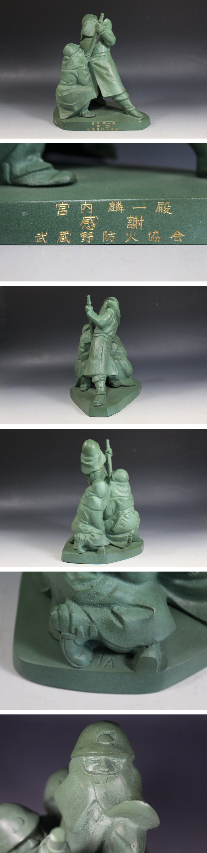 サイズ:高23.0cm 青銅製 花田一男の防災像 共箱です。 三人の消防士の力強さのあふれる逸品です。 裏側に「HA」のサインがあります。 最後の写真は参考写真です。 小さな消防士です。 同じ作者だと思いますがサインがありません。 同時出品しています。 写真をご覧の上ご入札宜しくお願い致します。 ◆花田一男 はなだ-かずお 明治37年(1904)~平成4年(1992) 福岡県豊前市生。 12歳のときに直方に移る。 昭和14年に上京し平櫛田中(芸術院会員)に師事。 その後、その高い実力が認められ日展会員になる。 昭和14年院展初入選。日彫受賞3回。藍綬褒章受章。 | |