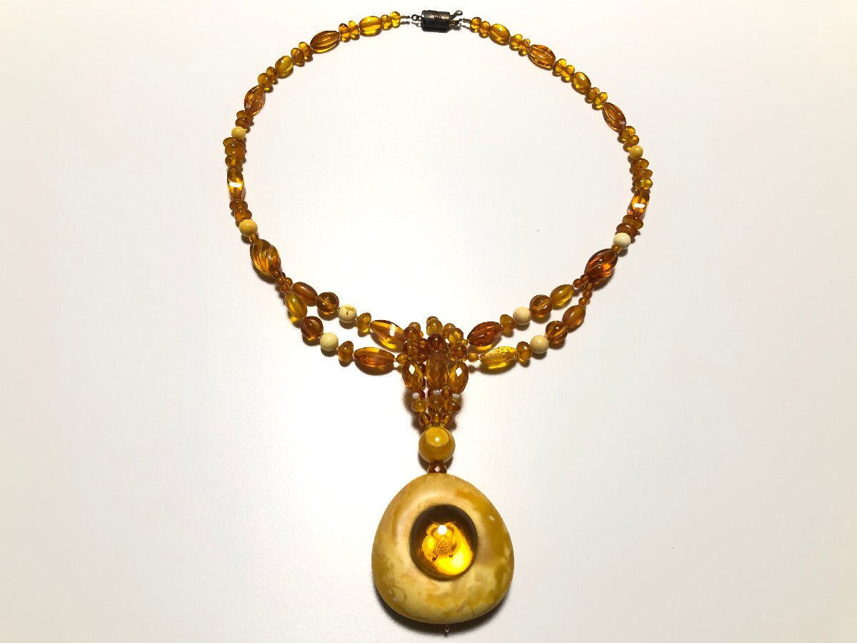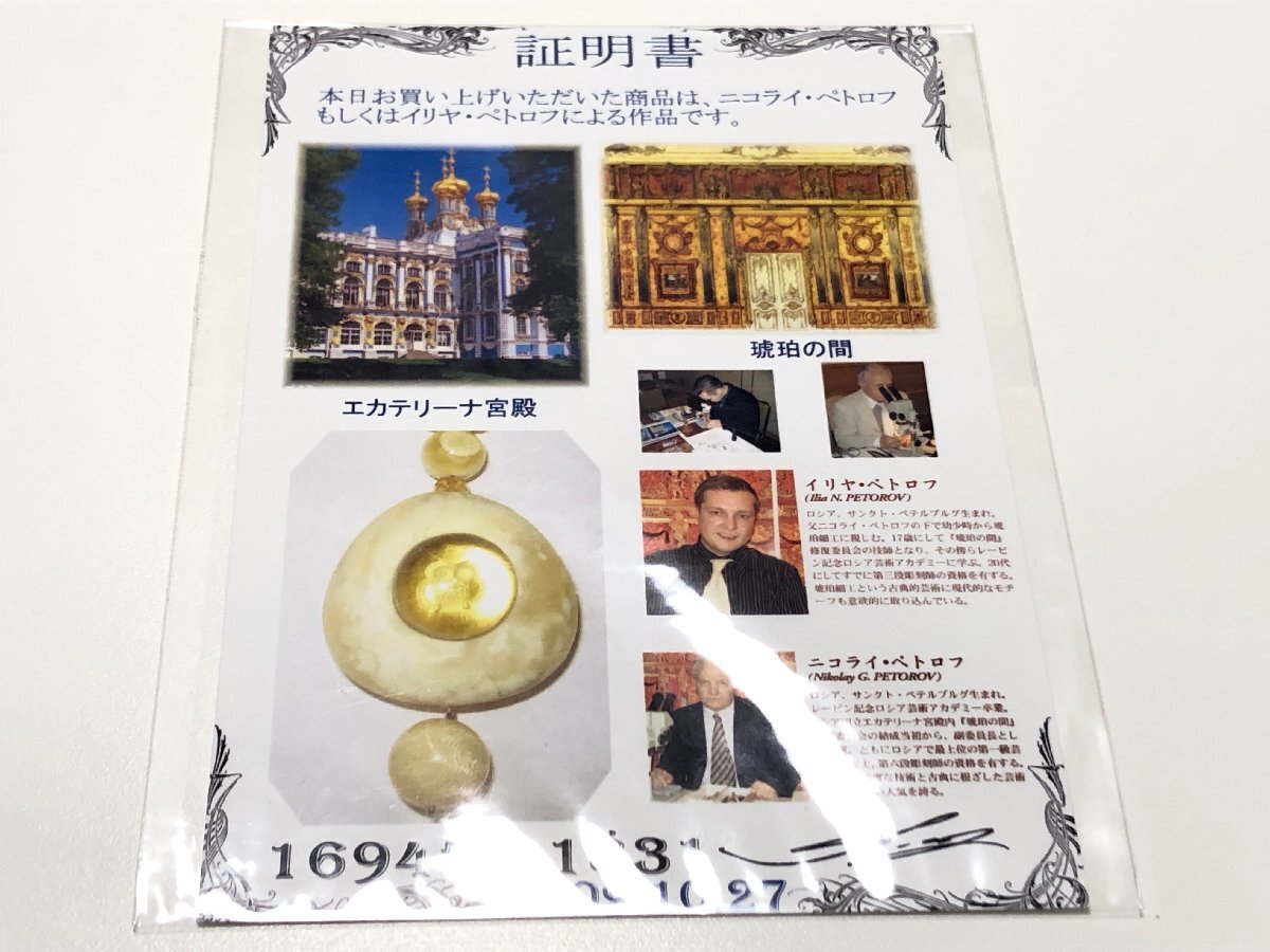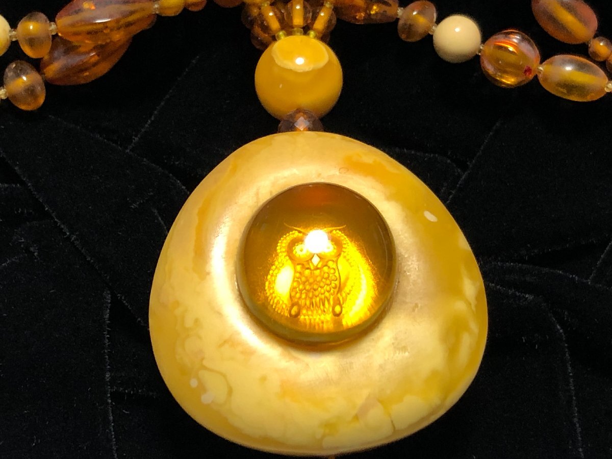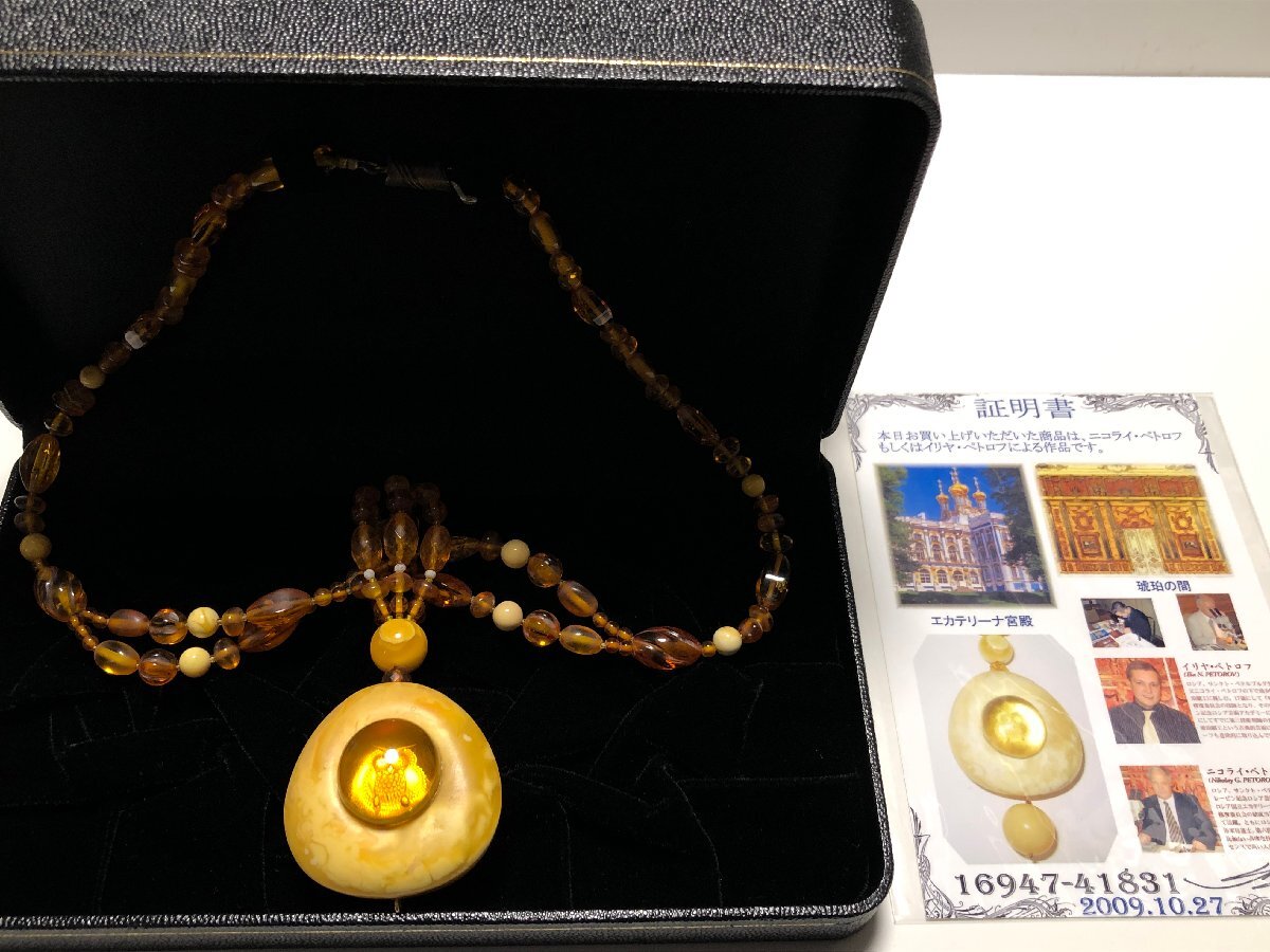 ロシア宮廷芸術家Petroff(ペトロフ) ロイヤルアンバー 本琥珀 28.5g 2WAY インタリオ 梟細工 ペンダントネックレス 証明書・ケース付属 收藏