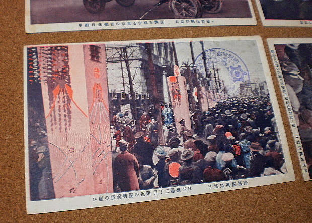 P1490【ポストカード】帝都復興祭當日 丸印 音楽花自動車 日本橋通三丁目 宮城二重橋前 伊勢町附近 昭和5年■■4枚 收藏