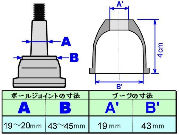 【商品詳細】 ボールジョイント用ブーツ(1個) 劣化・磨耗して切れたブーツとその固定リングなどを取り除いて、ボールジョイント部分にに被せて使用します。 材質:NBR(ニトリル系ゴム) 本品はボールジョイント寸法が画像2の寸法に適応します。 A寸法:19-20mm、B寸法:43-45mm ●形状・色は画像のものと異なる場合があります。 【適合車種】 シボレー/GMC 92-99 タホ、ユーコン 71-96 G10、G20、シェビーバン、バンデューラ 95-03 エクスプレス、サバナ 他 ●上記で適応しな井車種も一部あります。落札前に形状確認おねがいします。 ●車種適応が不明な方は、画像2のA寸法、B寸法とVIN(17桁のシリアル番号)を添えて質問してください。 | ||