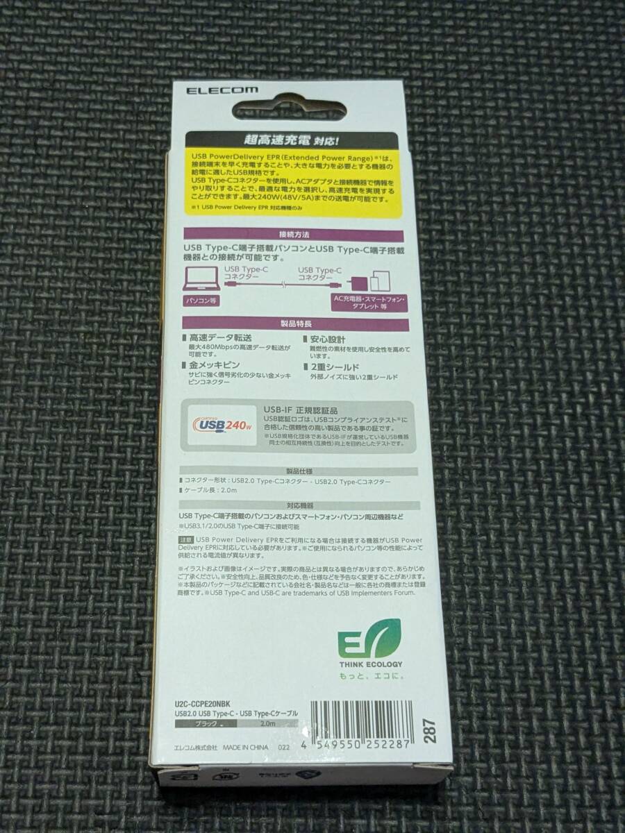 ◎0709u0532 エレコム USB Type-C ケーブル USB PD EPR対応 240W USB-C & USB-C USB2.0規格 2m ブラック U2C-CCPE20NBK