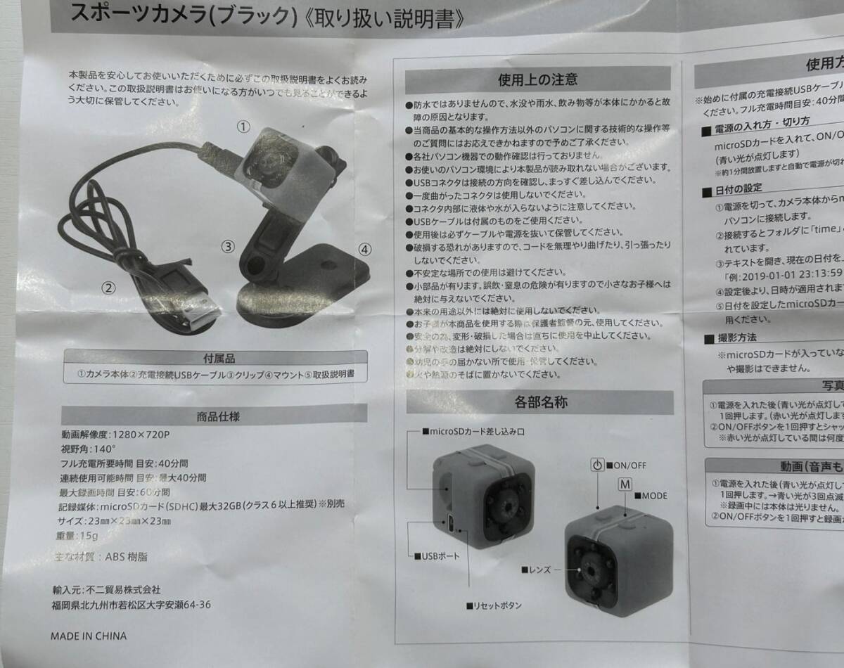 | 商品説明 | ご覧いただきましてありがとうございます。 SPORTS CAMERA スポーツカメラ 小型カメラ 23×23×23㎜ 未使用品ですが中身確認の為、開封してます。 付属品は写真でご確認ください。 一度人の手に渡っていますので、 気になる方は購入をお控えください。 |