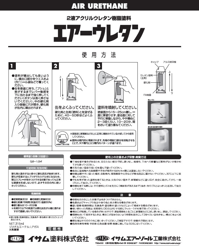 イサム塗料エアゾール 【内容量】315ml 【標準塗り面積】0.6~1.0㎡(2回塗り) ★特徴 優れた光沢・肉持ち・耐候性・耐水性・耐薬品性 !! 2液性アクリルウレタン樹脂塗料が簡単にスプレー可能!! ★用途 ○自動車・オートバイなど ○各種パーツ ○金属製品(非鉄金属[アルミ・ステンレス等]への直接塗装は除く) ○プラスチック類(FRP、ポリエステル、ポリアミド、硬質塩ビなど) ※色見本は撮影状況・モニターにより実際の色と異なるため、 イメージとして参照下さい。 ◆複数色ある場合 ①ご希望色×必要数量を落札 ⇒ まとめて取引依頼 ②質問にてご希望色×数量を連絡 ⇒ 合計金額にて個別出品 ⇒⇒ エアーウレタン29色 他出品商品はこちら | |