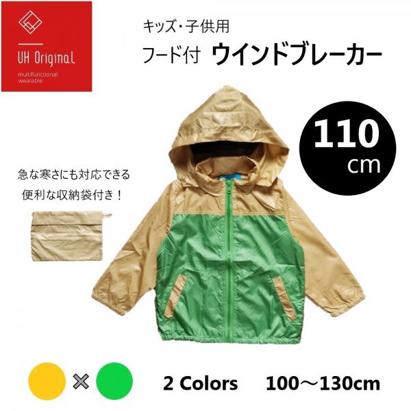 【即日出荷】ウインドブレーカー キッズ 110 ジャンバー マウンテンパーカー トップス 黄 袖イエロー フード付き ポケッタブル 収納袋付き 收藏