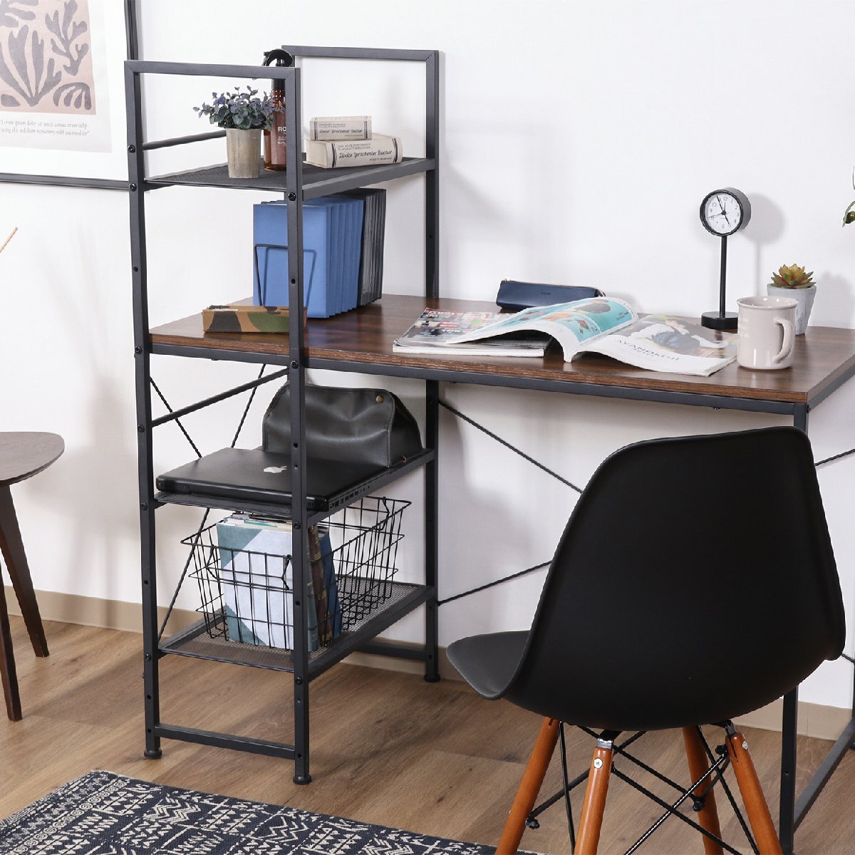 送料無料 左右組み替えラック付きワークデスク 作業台 シンプル リビングデスク パソコン作業 幅110cm 奥行53cm 高さ115cm ブラウン 新品 收藏