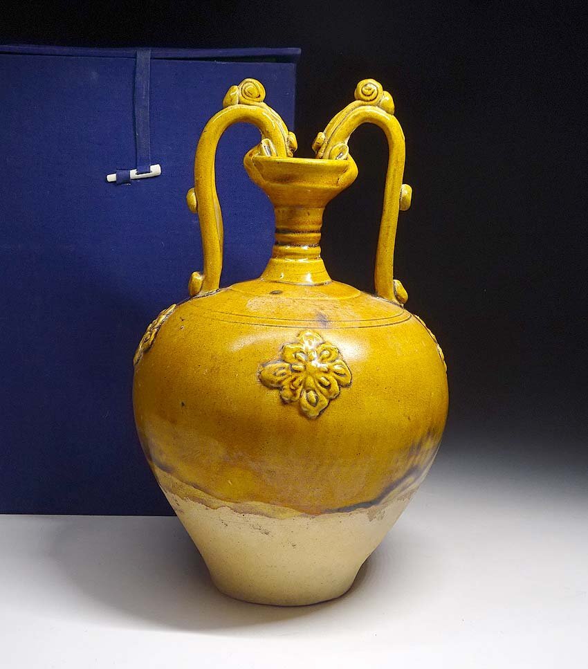 緑屋s■ 中国古玩 黄釉 双耳 壷 花瓶 龍耳瓶 箱付 唐物 時代物 i9/10-6232/12-4#80 收藏