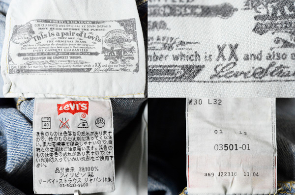 生産された03501は一本一本が違う箇所に手作業による色落ち加工やダメージ加工が施されています。
