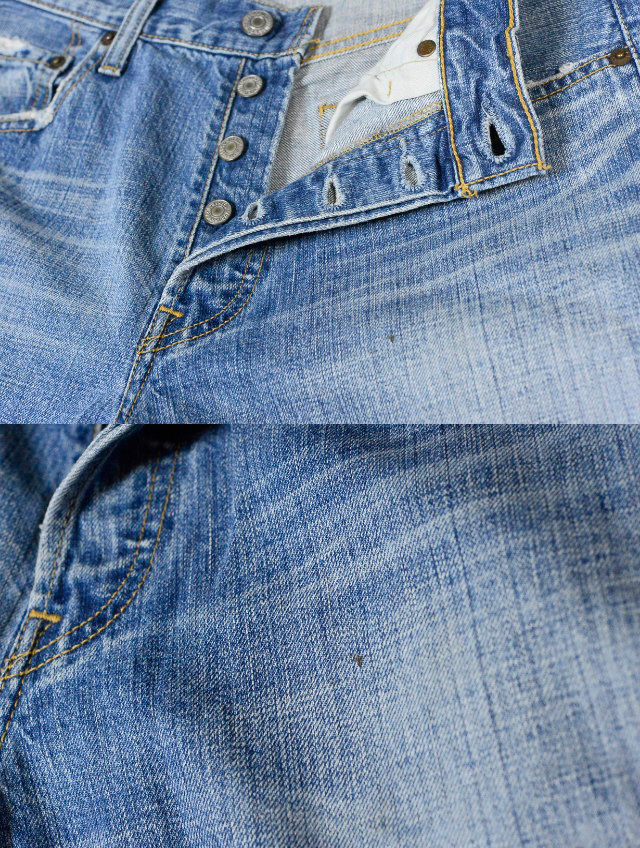 フロントにやや傷とダメージと色落ち加工がされた物 {ポケット周辺や裾周りのダメージも含む}