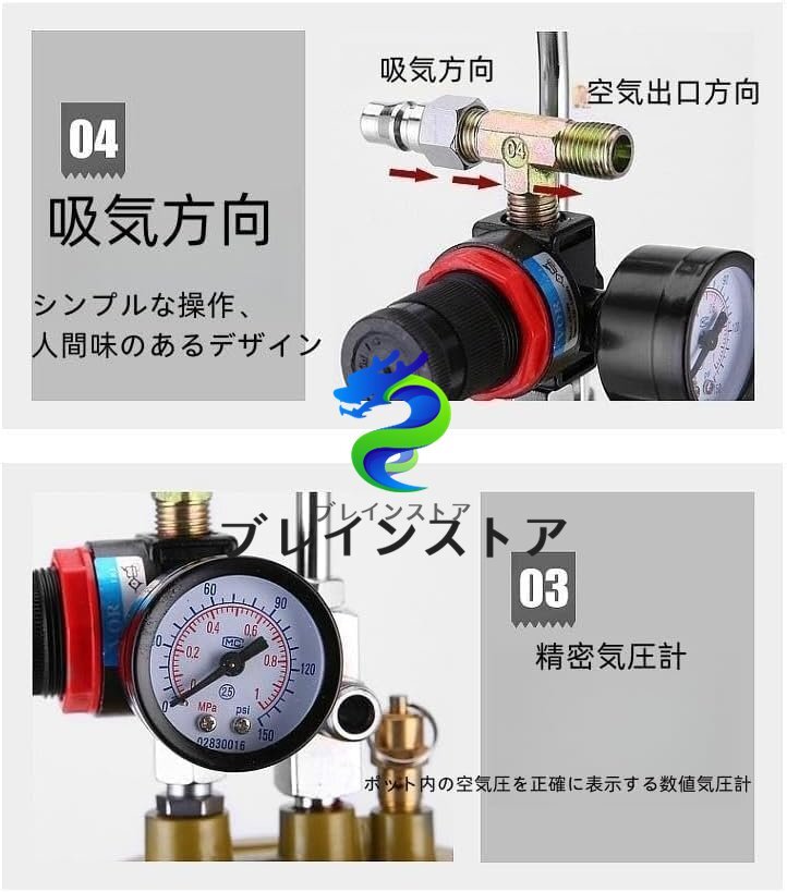 [安全設計] - 圧力計と流体圧力調整器は、正確な設定、安全性と安定性、および長寿命を保証します。※過剰な圧力になると安全弁が開きます。内部塗料量によっては安全弁が開いた場合、周りに塗料が飛び散る場合がありますのでご注意下さい。 ※レギュレーター全閉状態から、徐々に圧を上げてください。