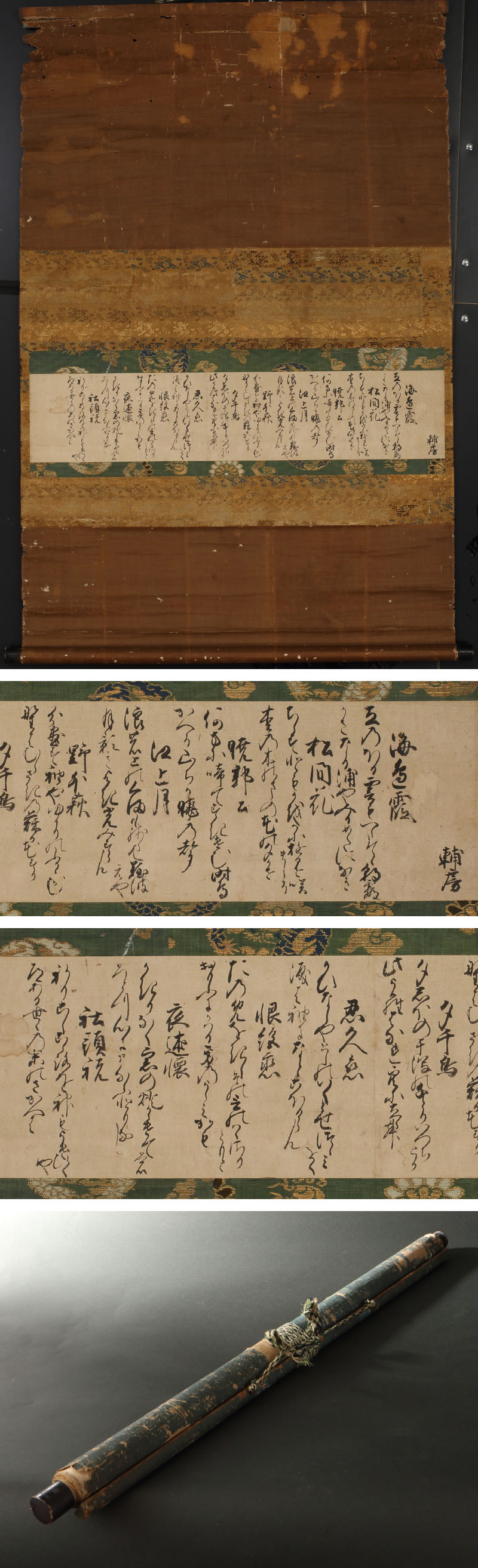 万里小路輔房の十首和歌詠草です。 「海辺霞・松間花・暁郭公・江上月・野外萩・夕千鳥・忍久恋・恨絶恋・夜述懐・社頭祝」の十首を認めております。 輔房は父惟房とともに正親町天皇の外戚として朝廷運営に参与、織田信長台頭期の困難な政局の収拾に努めました。利休と同時代の人物として茶席で珍重される父と同じく、尊鎮流の名手として知られます。本作は歌題から住吉社に奉納された法楽和歌とみられ、住吉明神を歌道の祖と仰ぐ、中世以来の歌道の伝統を色濃く受け継ぐものとなっております。 尚、惟房・輔房父子は永禄2(1559)年、当時松永久秀の右筆であった楠長諳(楠木正虎)の要請を受け、楠木正成朝敵赦免の正親町天皇綸旨を発給しており、楠木正成の名誉回復の先駆けとなったことで知られます。正虎は正成とは無関係の伊勢楠(くす)氏の出身であるとの説もありますが、生前から和泉国の土豪、そして備前焼の窯元として勢力を伸ばした大饗氏と同族とみなされており、楠木氏の末裔であった彼らから厚遇を受けたことで知られます。また、伊勢楠氏の出身とすれば、伊勢に所領を持った万里小路家とは綸旨発給以前の関係があったことが推察されます。 以上の史実から、万里小路惟房・輔房の書蹟が茶席で珍重されてきたのは、単に利休の同時代人の能書家、有力歌人であるのみならず、楠木氏の末裔が多く住する堺の商業的発展や備前焼の普及に多大な恩恵をもたらした人物とみなされたことが一因と推察されます。そして長諳を介し商都堺からの支持や松永久秀への連絡路を有したことは、万里小路家にとっても朝廷の権威回復や織田信長との政治的交渉に有利に働いたに違いありません。 戦国期の流麗な書を是非ともお楽しみください。 ◆万里小路輔房 戦国-織豊期の公卿。万里小路惟房の子。永禄6(1563)年参議兼右大弁となる。のち権中納言,正三位。天正元(1573)年没、32歳。初名は頼房。 〔本文〕 輔房 海辺霞 立のほる雲もへたてゝ朝霞 かさなる浦やみるめたになき 松間花 ちらすともかをたにゆるす咲ましる 松の木のまの花の夕かけ 暁郭公 何方に啼てすきけむ時鳥 かへるやまちの暁の声 江上月 浪の上のくまも残らて難波えや 月影きよき光みすらん 野外萩 分尽すそでやゆかりのふかゝらむ 野はむらわきの萩か花むら 夕千鳥 夕しほの干潟の千とりいつちとり 此からはなれ空に立らむ 忍久恋 かひなしやとしのいくとせつつみをく 涙は袖になとこほるらん 恨絶恋 たのめをきしその言のはゝちりとも おもふにかはる身のうらみかも 夜述懐 かきりなく窓の灯かゝけても ひとつ心にかなふともなし 社頭祝 祈りこしこゝろを神もうけひてや 道ある世々の末のさかへは 寸法:高さ113cm、幅74cm(最大幅。若干の誤差はご了承下さい) 状態:虫食い、イタミがございます。 |