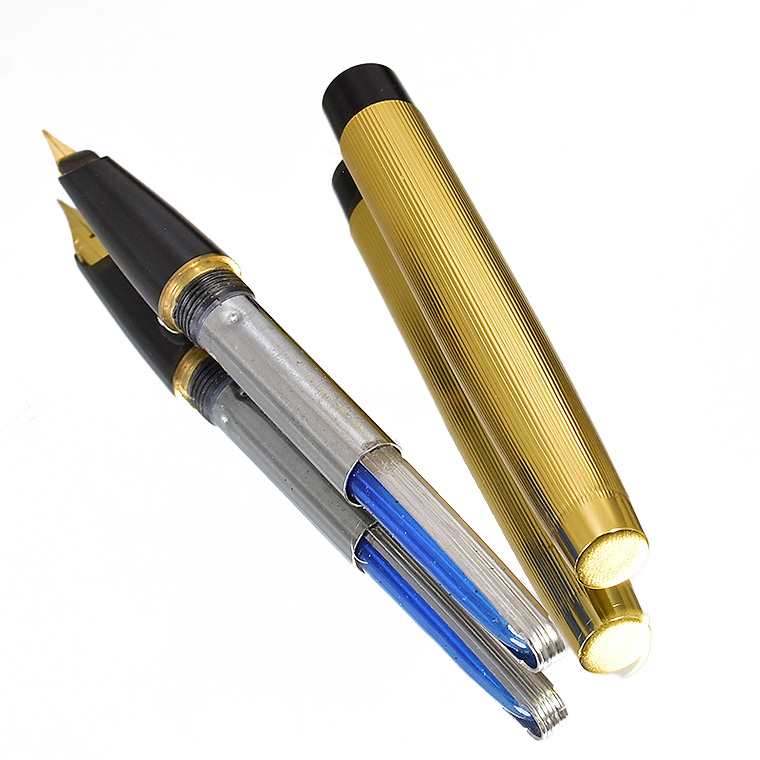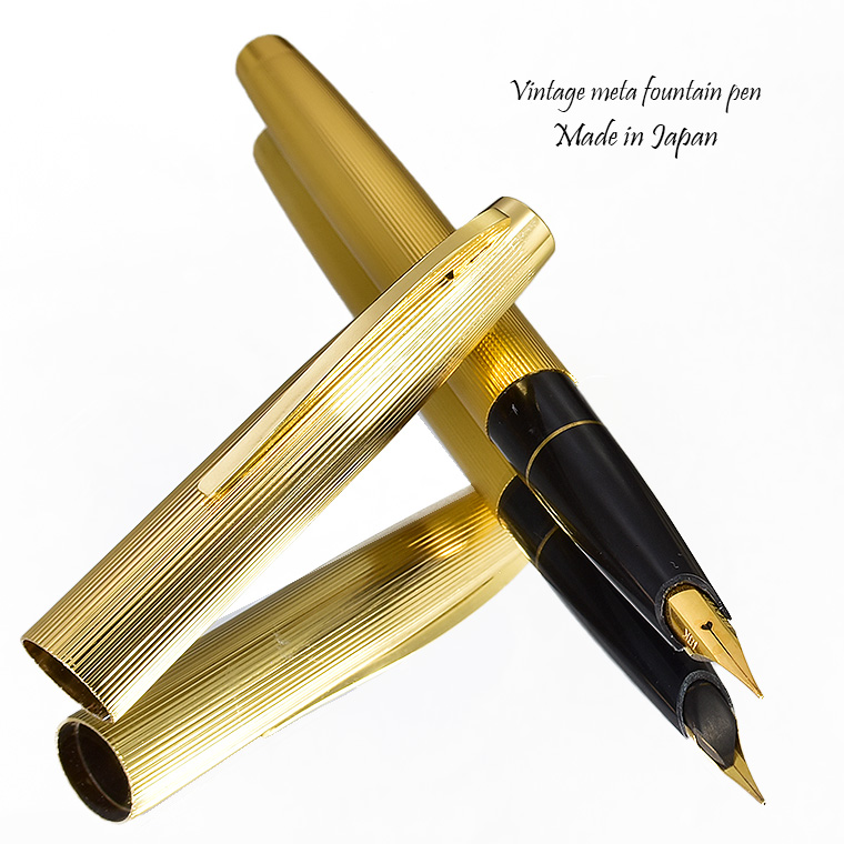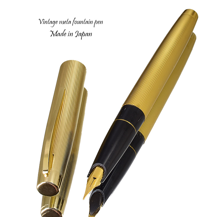 ■●ビンテージ 万年筆 職人が再生 ゴールド 金属製 ストライプ 爪型 18KGPペン先 EF 極細 中押し式 金色 レトロ 希少 調整済 1円~/K415a*
