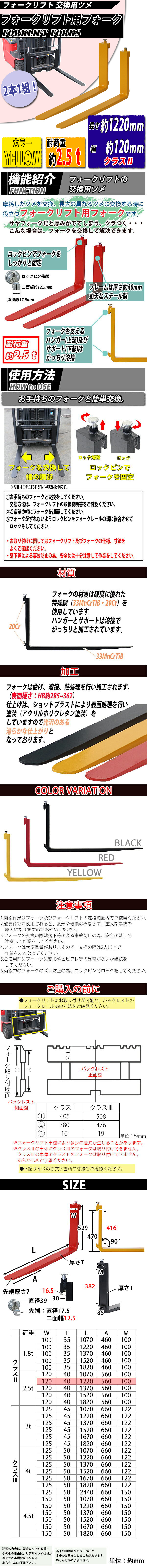 送料無料 フォーク 爪 2本セット 黄 長さ約1220mm 幅約120mm 耐荷重約2.5t 厚さ約40mm フォークリフト用 交換用 フォーク ツメ イエロー 收藏