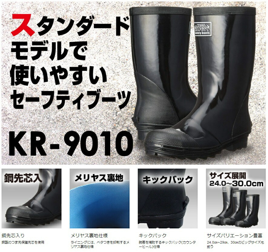 KR-9010 BLK ブラックメガセーフティ 安全ゴム長靴■軽半タイプの安全ゴム長靴■つま先や踵部の負荷がかかる部分にはゴムを2層にし補強■スタンダードモデルで使いやすい長さのセーフティブーツ■ライニングにはべたつきを抑制するメリヤス裏地仕様■ムレを防ぐインソールもセットされています■脱着を補助するキックバック(カウンターヒール)仕様重さ:約790g※片足26.0cm靴幅:EEE先芯:鋼先芯材質:アッパー/合成ゴム ソール/ゴム※この商品はお取り寄せの為、発送までに1~2週間かかります。メーカー欠品等でご注文をお受けできない場合が御座います。