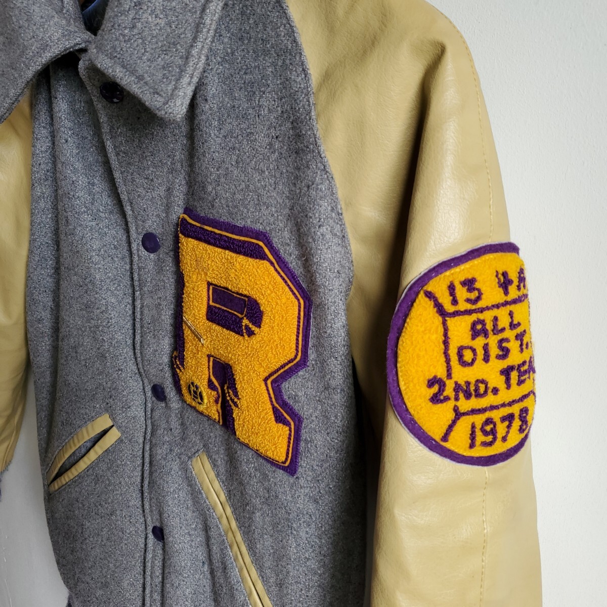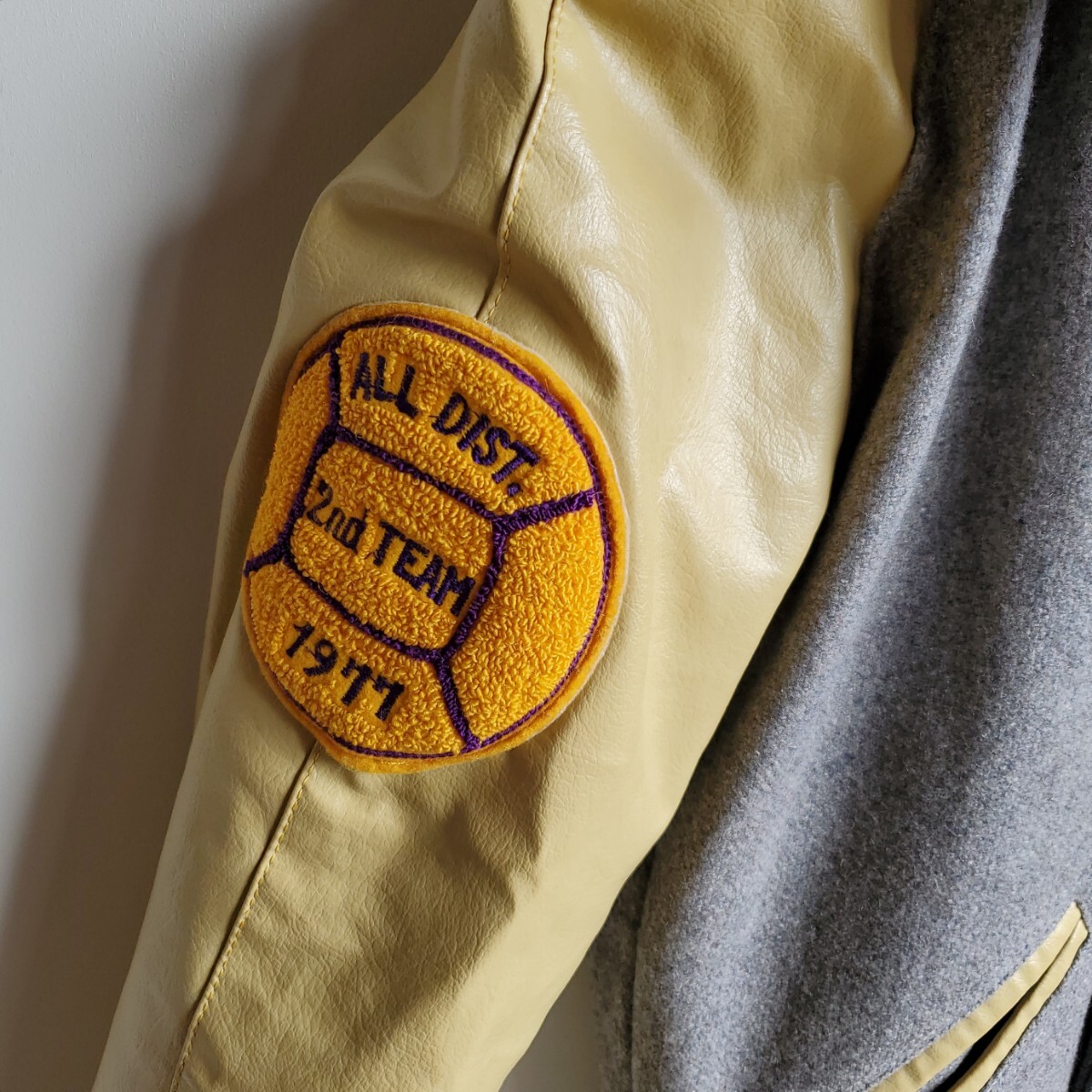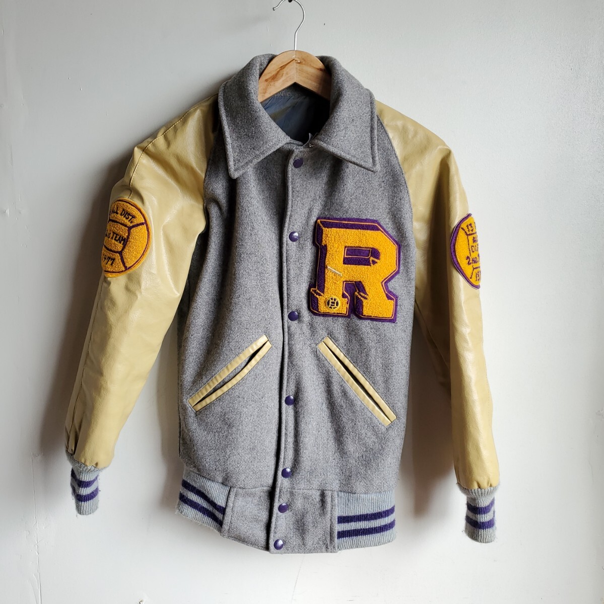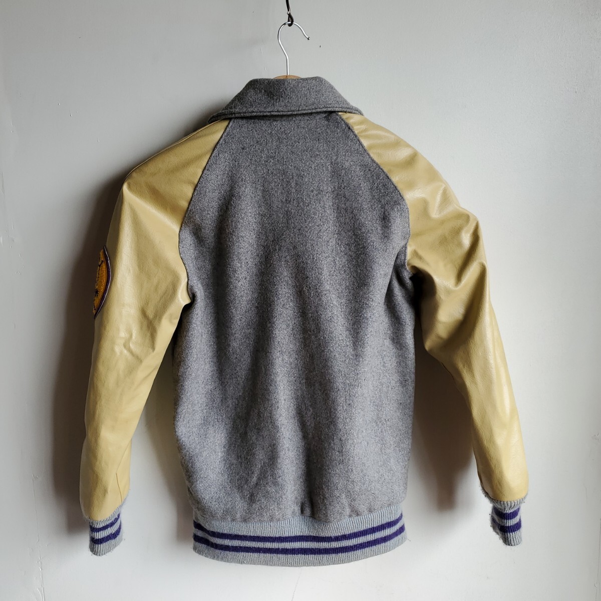 1101◆【size30】70s レザー袖 スタジャン クリーム×グレー ワッペン 1977 1978 レディース キッズ 中古 USED vintage 古着 收藏