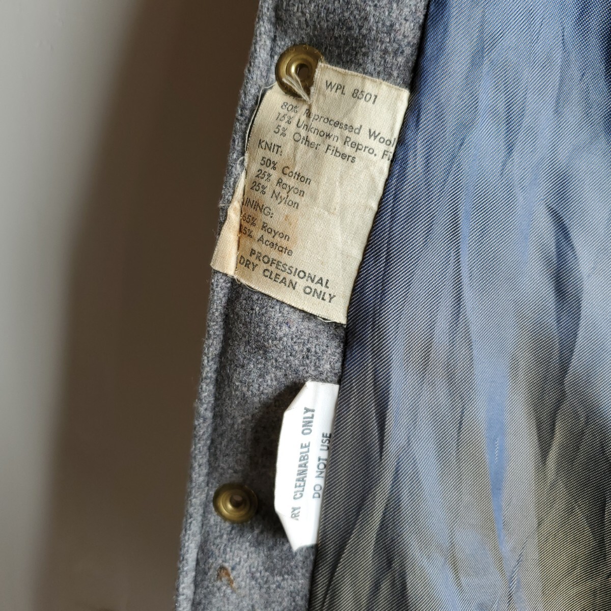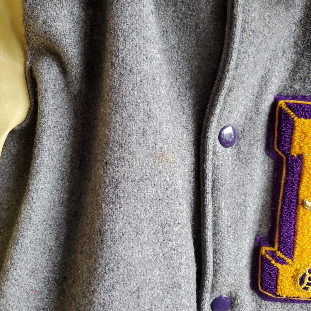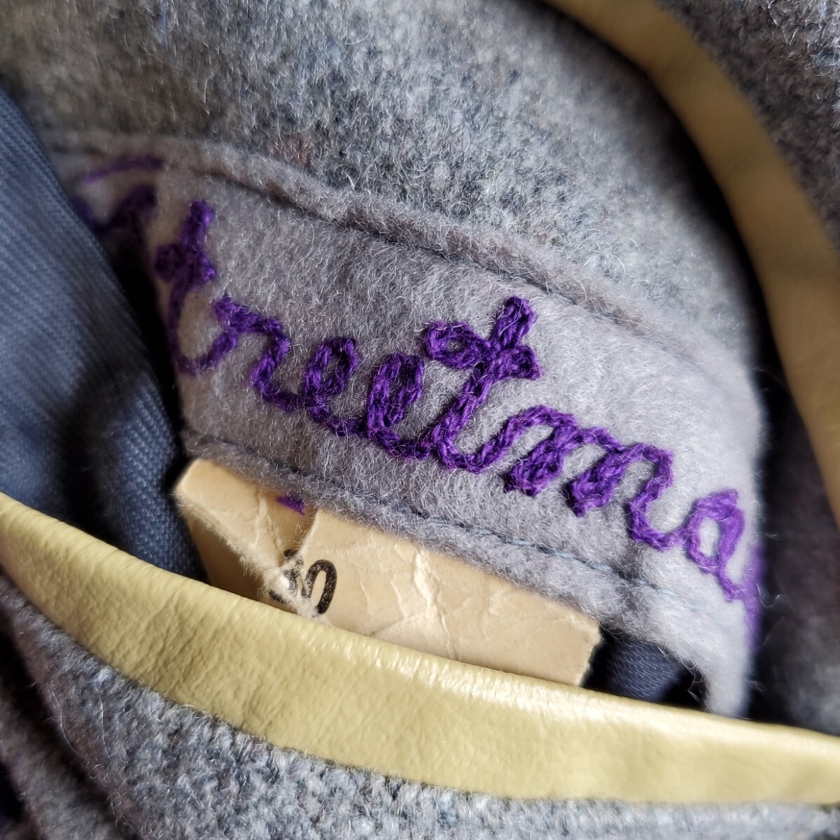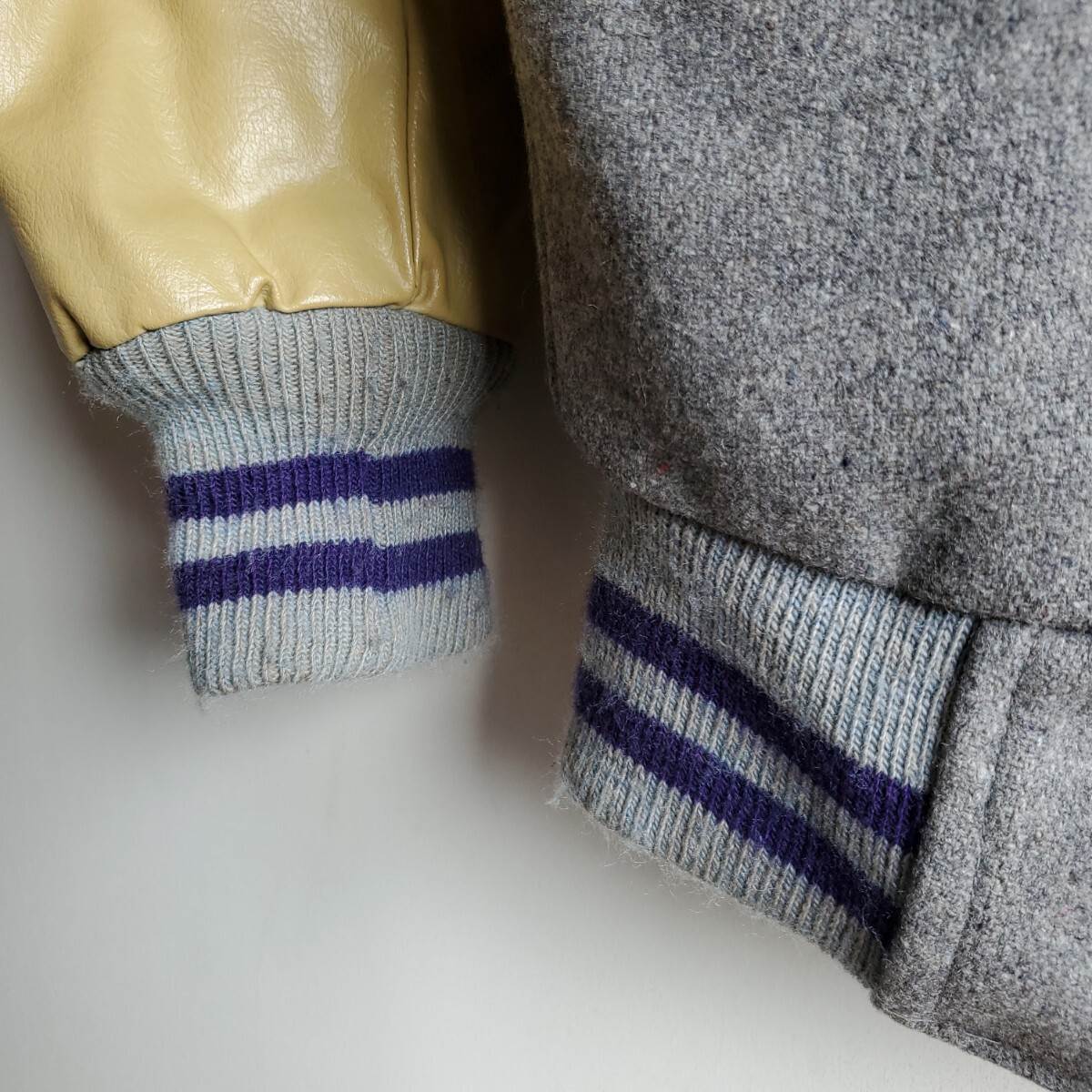 1101◆【size30】70s レザー袖 スタジャン クリーム×グレー ワッペン 1977 1978 レディース キッズ 中古 USED vintage 古着 收藏
