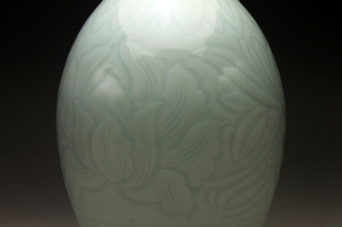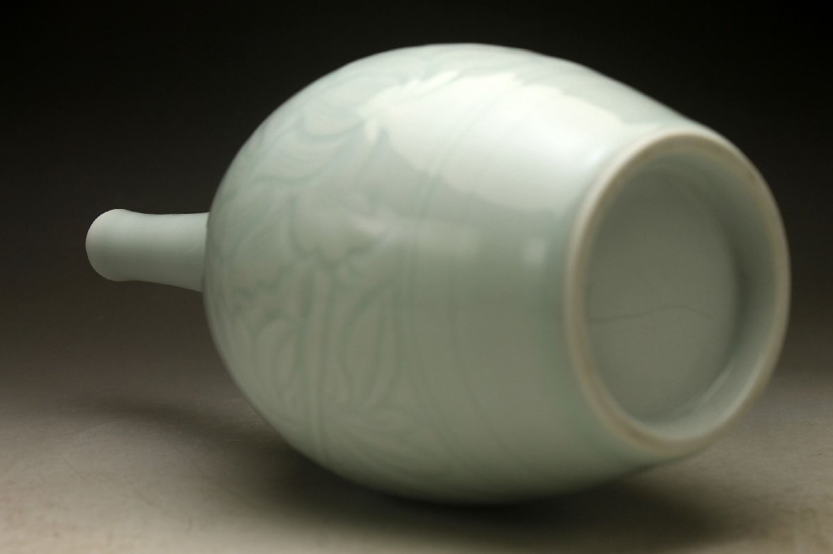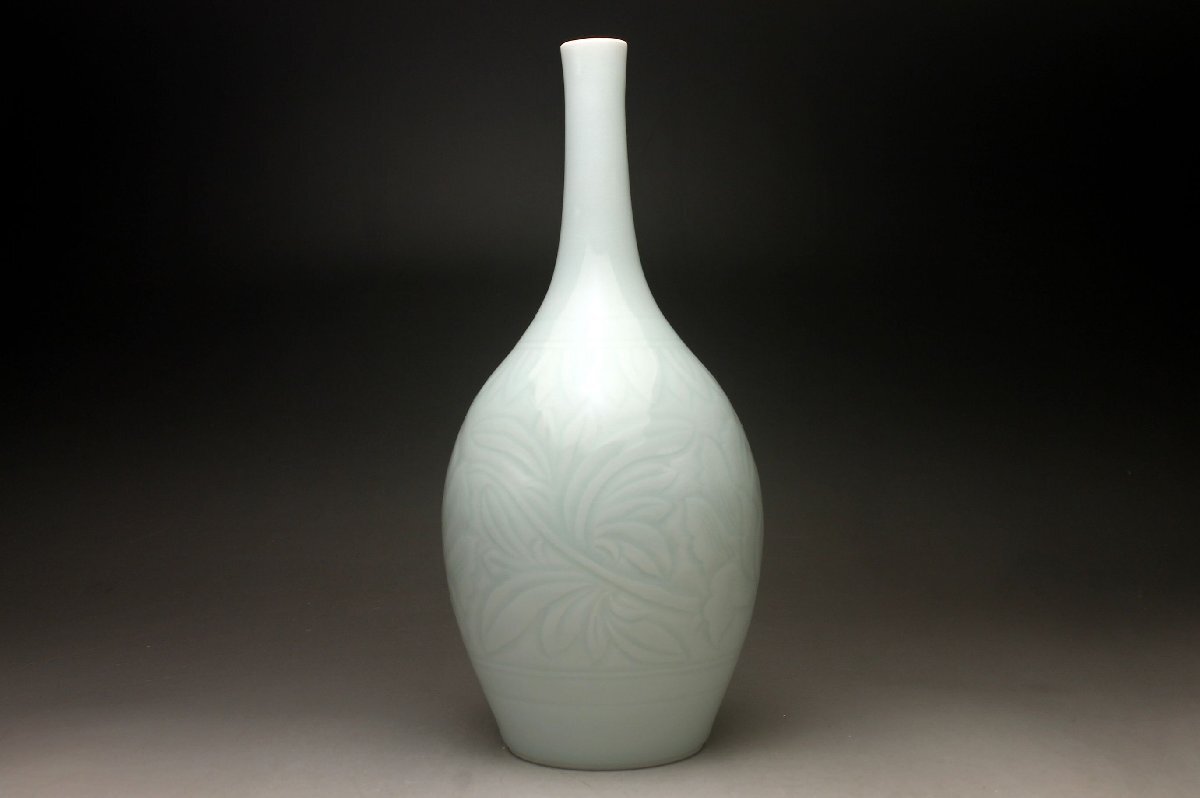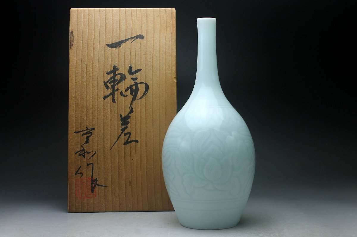 【余韻】 京焼 青白磁 陽刻唐草牡丹文 鶴首花瓶 一輪差★華道具 共箱 無傷美品<同梱可> 收藏