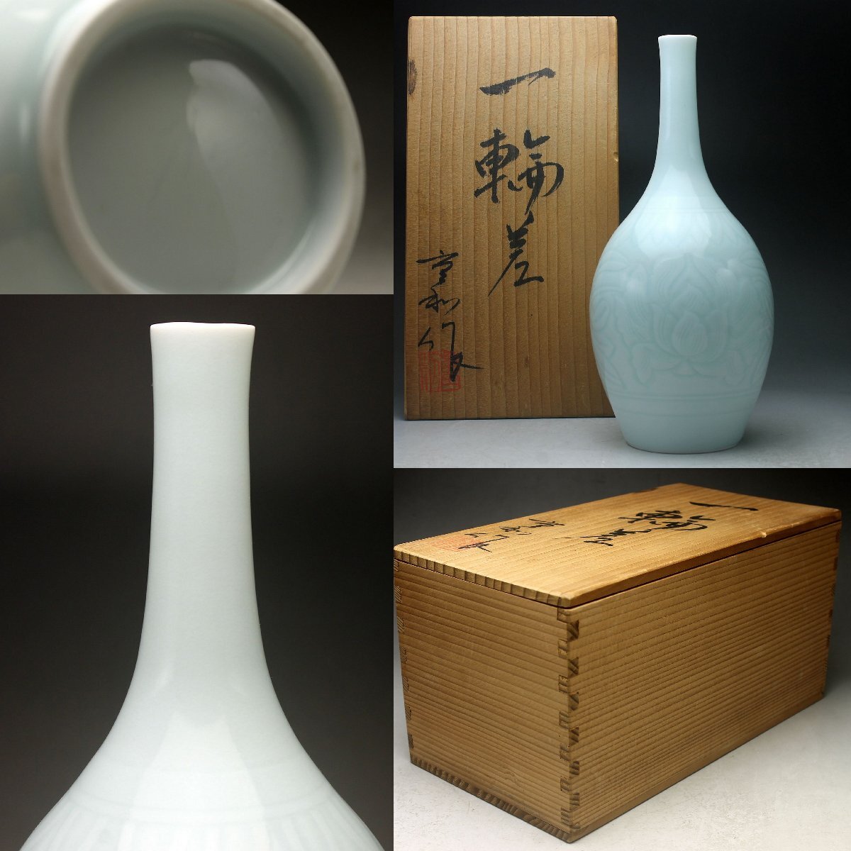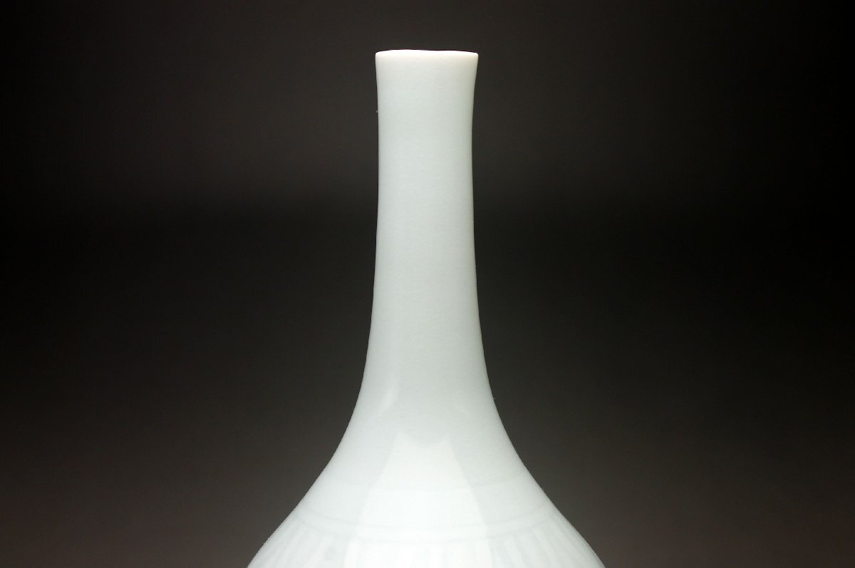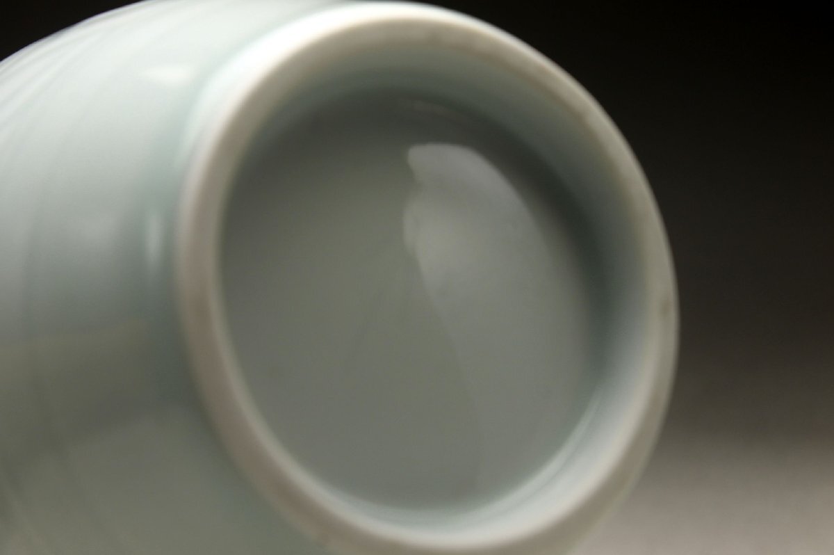 【余韻】 京焼 青白磁 陽刻唐草牡丹文 鶴首花瓶 一輪差★華道具 共箱 無傷美品<同梱可> 收藏