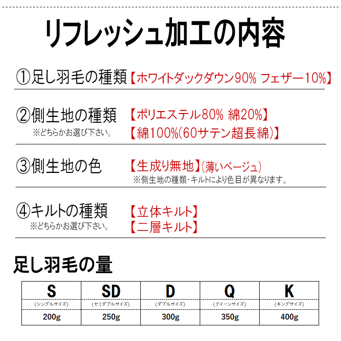羽毛布団 リフレッシュ 加工 キング 打ち直し 足し羽毛 布団リフォーム プレミアムダウンウォッシュ仕上げ 軽量生地 二層キルト 收藏