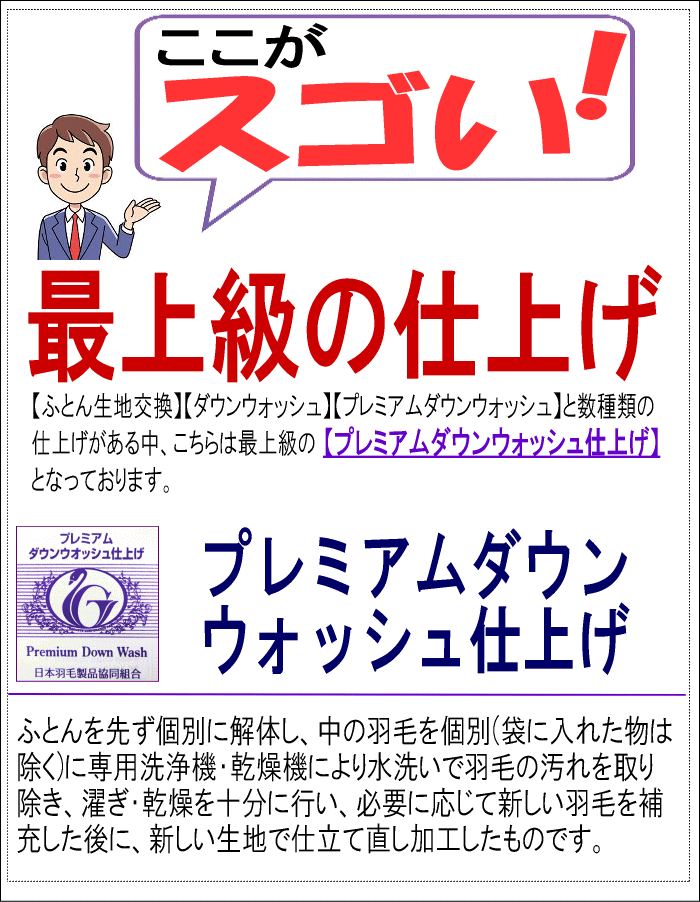 プレミアムダウンウォッシュ仕上げ