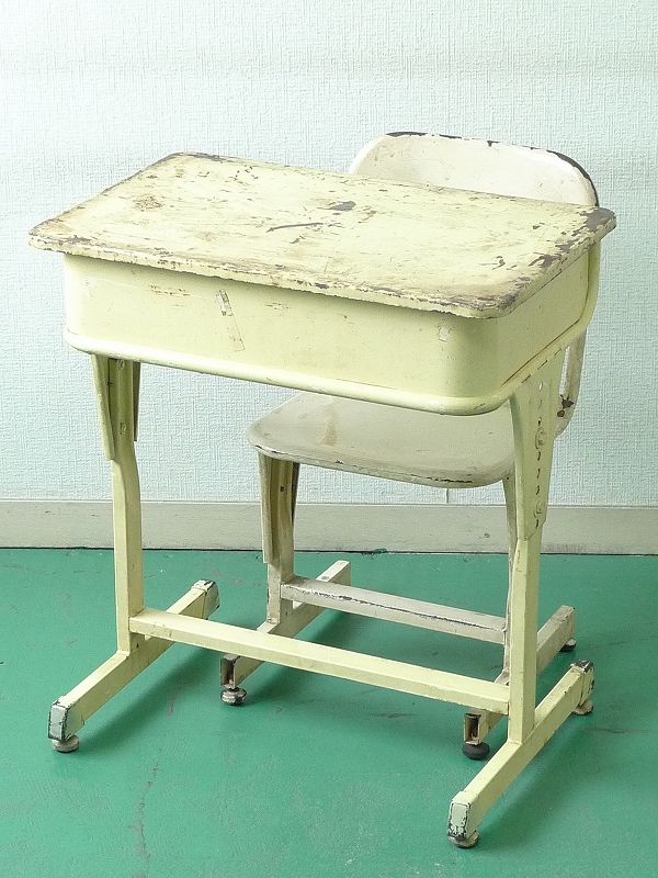 18AB900▲ヴィンテージ アイアン・鉄製の古い学校机と椅子・昭和レトロ学習つくえデスクイスいす小学校 收藏