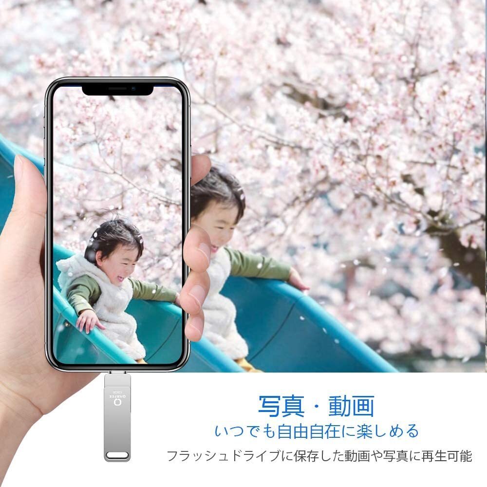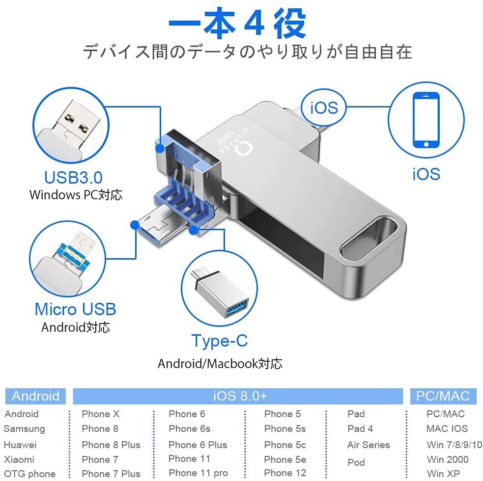 XUB1/128g日本限定usbメモリ128G BusbメモリiPhone ipad対応【高い互換性-4 in 1 USBメモリ】本 qarfee Phone USBメモリーにはiOS、USB 、Type- C、 microUSB の4タイプの差込口があります。互換性のあるデバイス:iosコネクタPhone/iPad/iPod、タイプCコネクタMacBook/Android Phone/PC、microUSB コネクタはAndroid、およびその他のUSBコネクタデバイス。Windows PCはもちろん、Android 、iOSやMacBookでも本 Phone USBメモリーを利用して、テバイス間のデータのやり取りが自由自在に共有できます。【互換性高いPhone対応USBメモリ】アイフォンバックアップはほとんどのAppleデバイスと互換性がありますPhone SE、12、11、11 Pro、11 Pro Max、 XS、XS MAX、XR、Phone X、Phone 8 Plus、Phone 8、Phone 7 Plus、Phone 7、Phone 6s Plus、Phone 6s、Phone 6、Phone 6 plus、Phone SE、Phone 5s、Phone 5c、Phone 5、iPad Air、iPad Pro、iPad、iPad miniシリーズ、iPod touch 5、Macbook Pro(ご注意、最新式iPad ProやMacebookのType-cに対応しません)。【簡単に操作&専用アプリ】スマホに入れたままの写真や動画、本qarfee USBメモリーで簡単保存します。Phone/iPad では、専用アプリでファイルの移動やコピーなど簡単操作で行えます。また、これは公式アプリとの互換性があり、両方でのファイルを共有化、自由に移動します、専用アプリ内でファイルの編集、暗号化ができます。連絡先の管理、バックアップ、リストアも簡単にも行うことができます。PC:本体はUSBメモリーとして簡単にPCと接続できます。