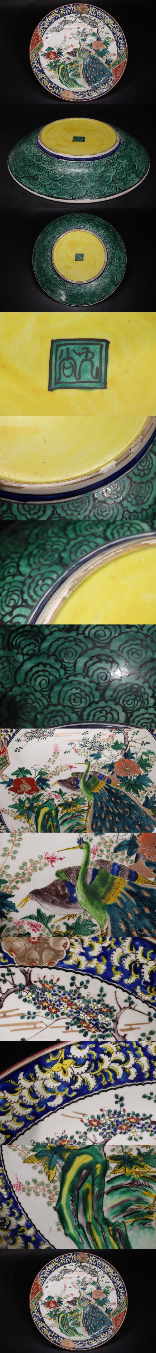 九谷 在銘 九谷焼 花鳥文 大皿 / 青手 青手九谷 青九谷 皿 茶器 煎茶道具 飾皿 .G2775 收藏
