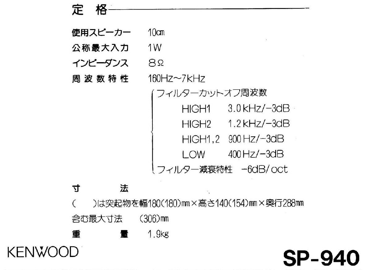 | SP-940【KENWOOD】外部スピーカー 点検・清掃済み 動作品 現状渡し品 | ||