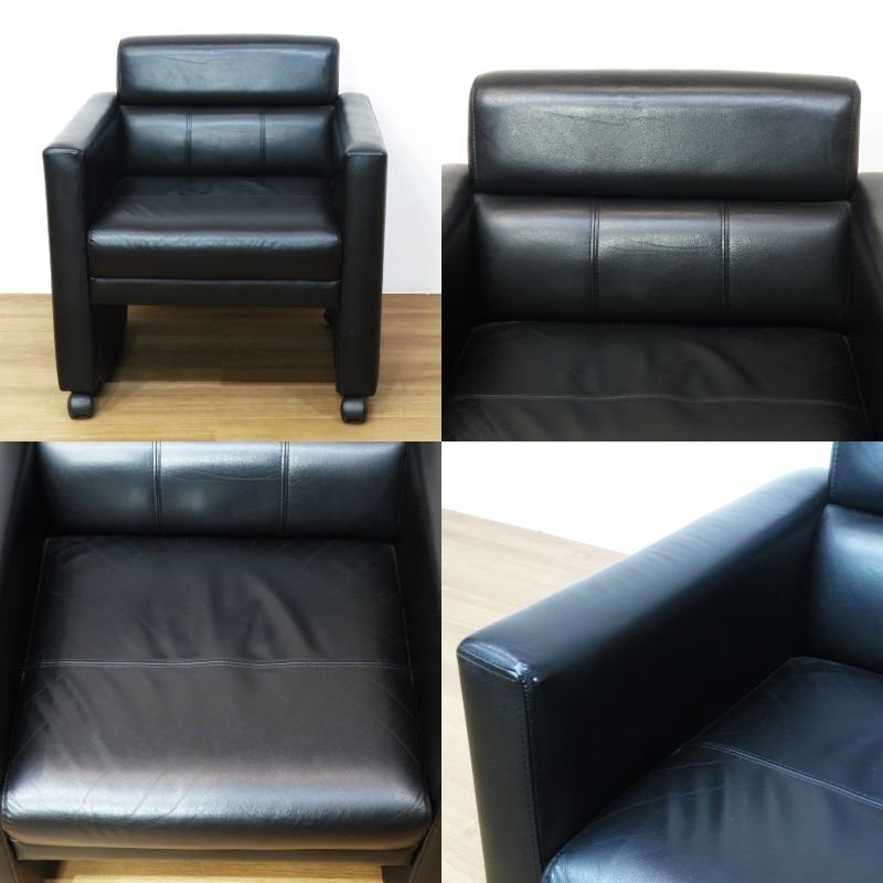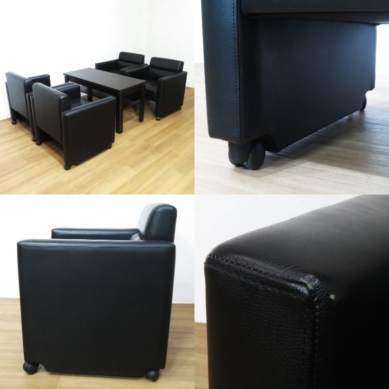 内田洋行の4人用応接セットが入荷しました。ブラックのソファとダークブラウンの木目調のテーブルセットです。 落ち着いた色合いで統一されたソファセット。 1人用のソファはキャスター付きで配置移動も楽々。 ブラックの張地は本革を使用。シックで高級感溢れる印象です。 シンプルで落ち着いた色合いで統一されたソファセットはより洗練された空間を演出できます。 応接室やエントランスロビー、受付など様々なシーンで活躍できます。 テーブルに多少目立たない傷がございますが、総合的に綺麗な状態でエグゼクティブなお客様をお迎えする会議室には最適なソファセットでございます。市場価格4分の一以下での中古品ならではの価格で推しでございます★★★。 |