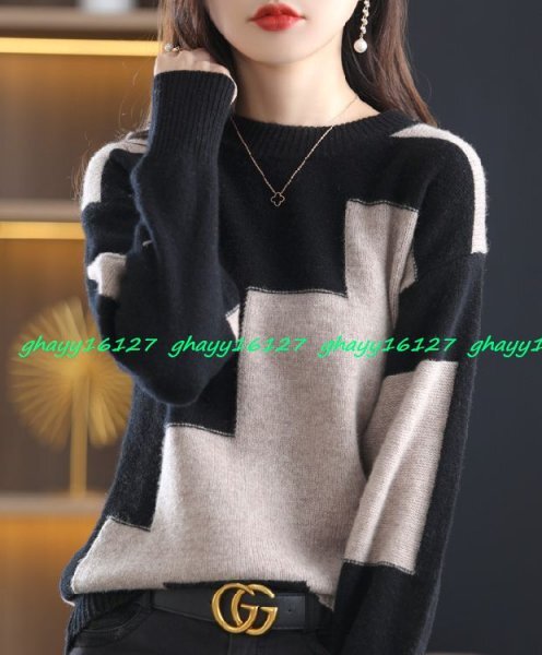 M ふんわり暖かカシミヤ90%★バイカラー配色 ニットプルオーバー♪モカ M 收藏