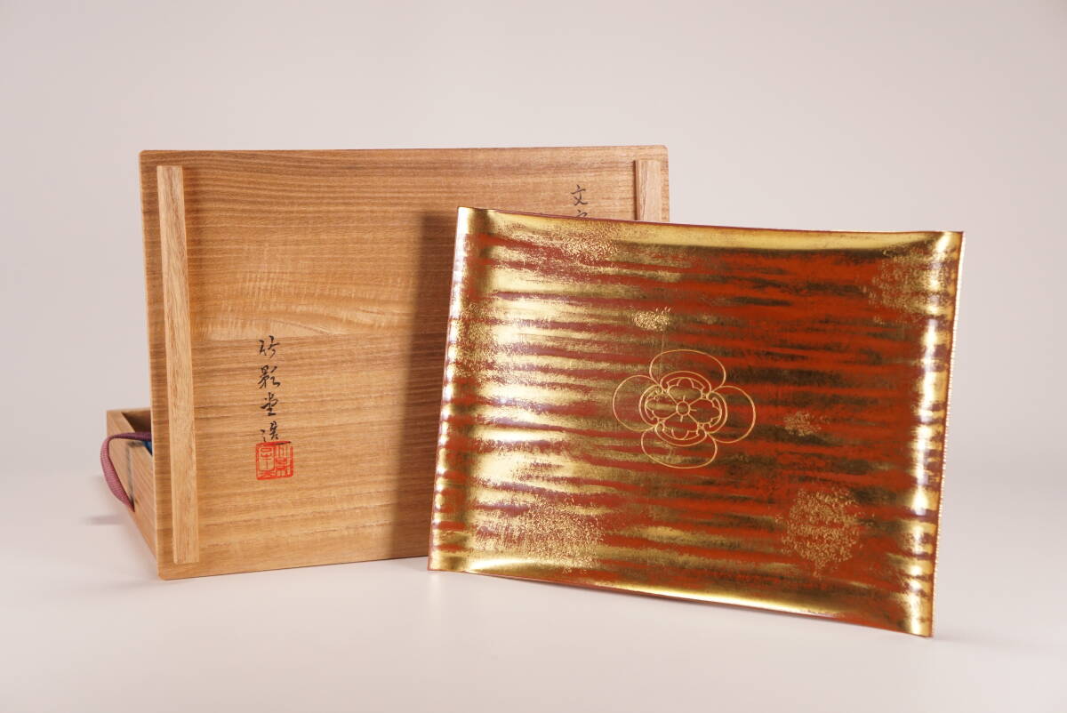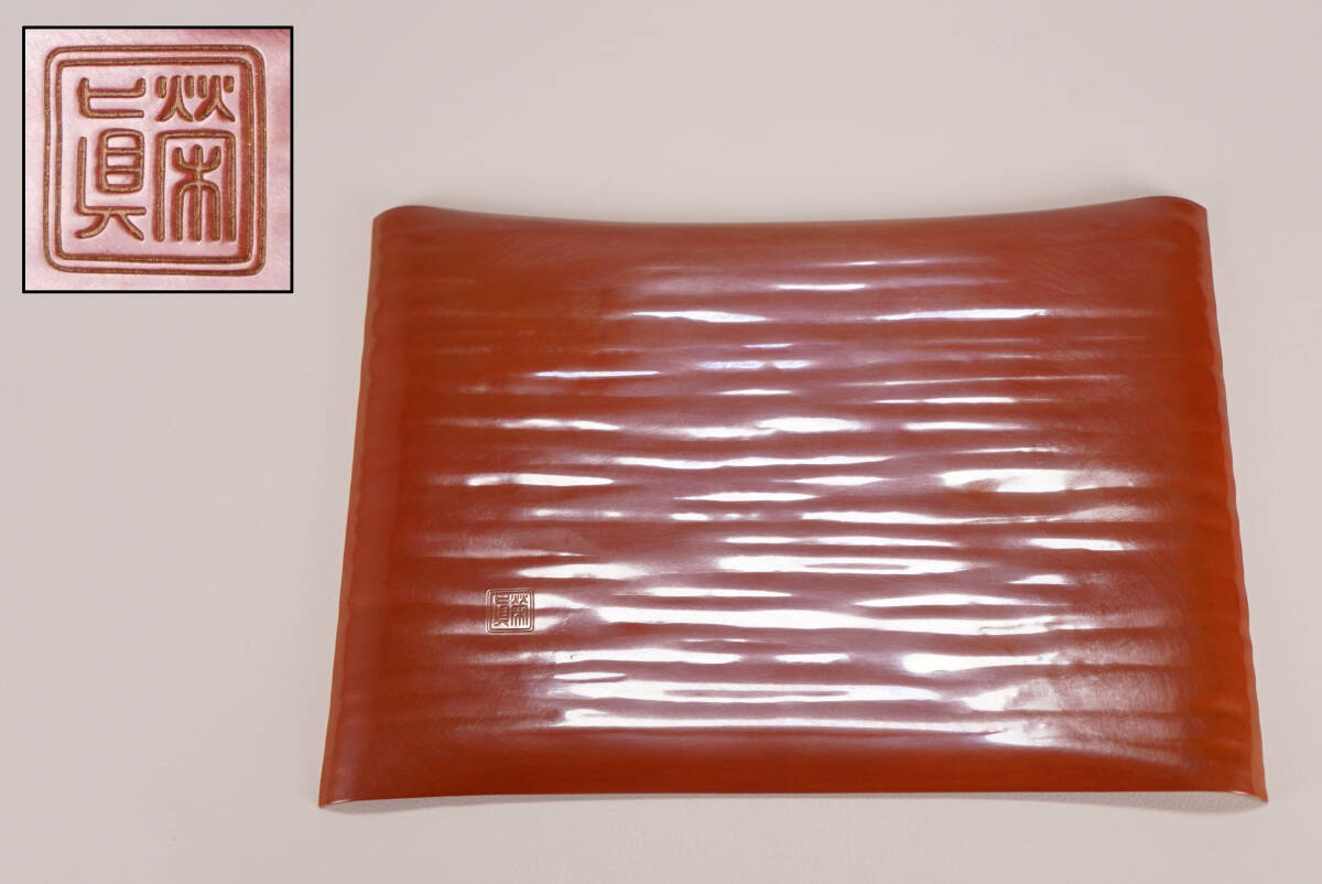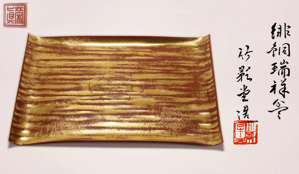 【asiya306】竹影堂『栄真』緋銅瑞祥盆 煎茶盆 在銘 共箱◆滅金 金工 彫刻 茶器 蔵出し 古美術 即決 送料無料 收藏