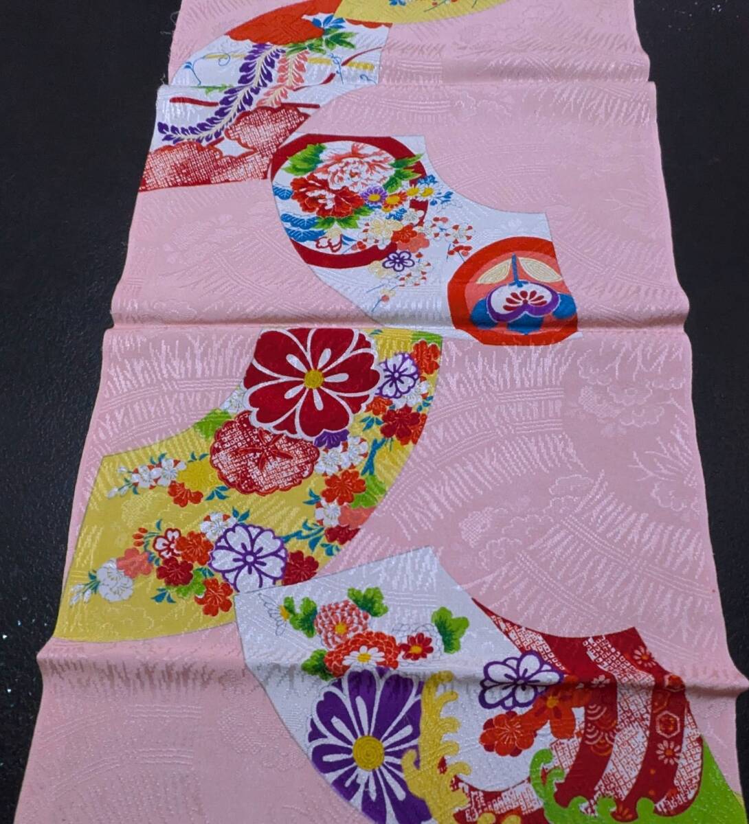 | 地色 : ピンク しなやかな紋錦紗縮緬ですピンク地に色とりどりの花が描かれた地紙流しの可愛いハギレです 解き布で状態は大変きれいです サイズ(センチ) 33.5x148 | |||