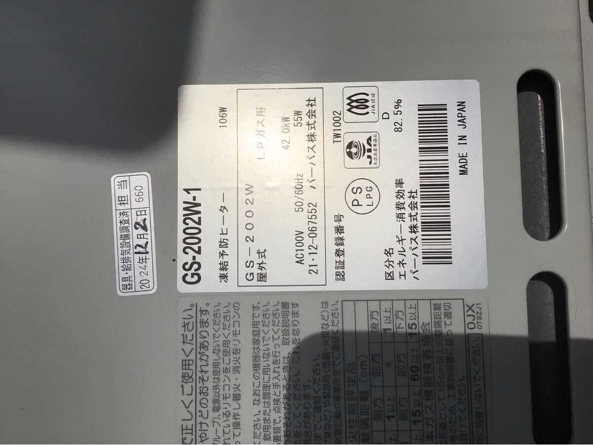 パーパス GS-2002W-1 プロパン 給湯器 2021年製 | |||