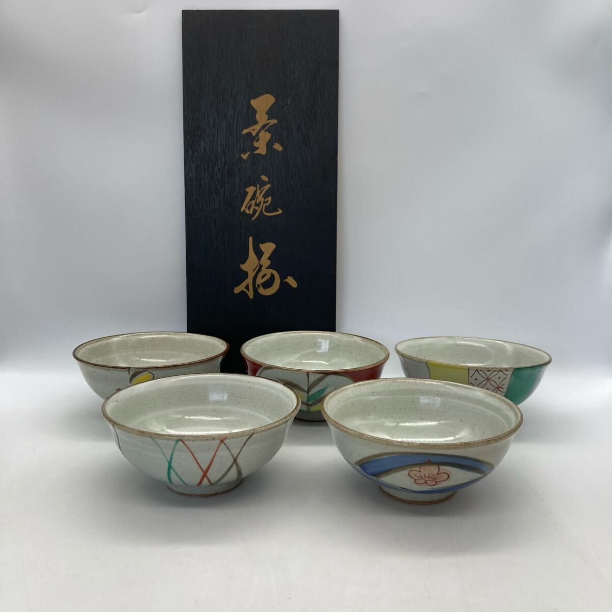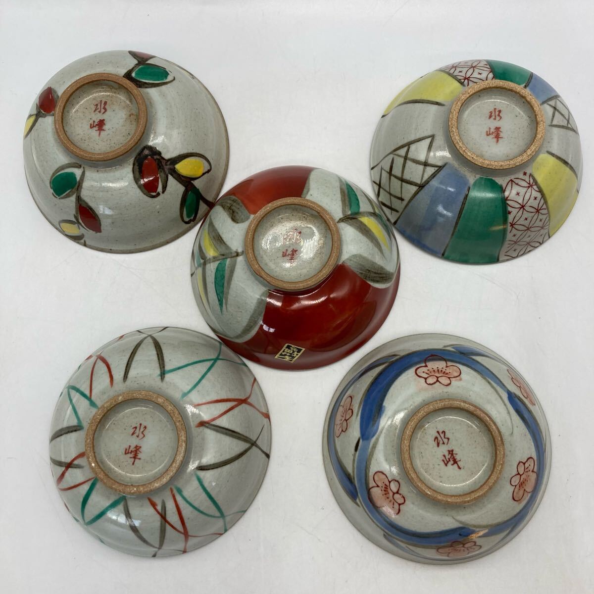M1021705N 茶碗揃 手書き 水峰 絵変わり 5個セット 和食器 ご飯茶碗 お茶碗 お椀 絵変 飯碗 工芸品 食器 当時物 中古品 現状品 收藏