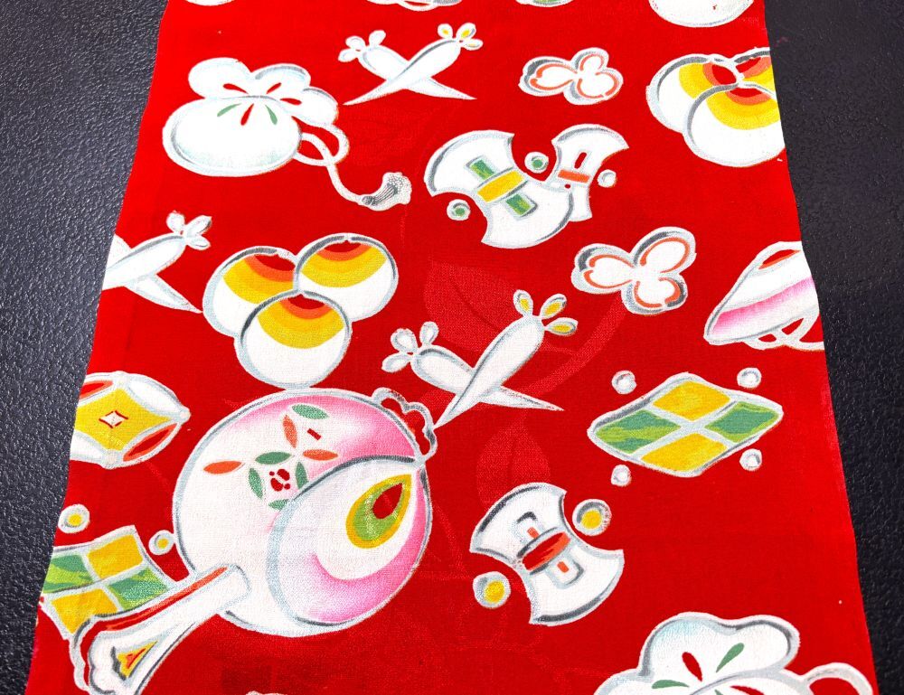 【古布*縮緬*和素材】正絹紋錦紗縮緬 可愛い小槌に吉祥柄 33.5x152*手作り*市松人形*パッチワーク*縮緬細工*雛節句*昭和レトロ 收藏