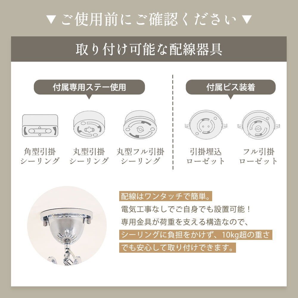 | 注意事項 | 新品・未使用品での販売ですが製造上での多少の小傷等はご了承願います 取り付けに関しましてはワンタッチでは御座いませんが(配線はワンタッチ)引掛けシーリングに対応しております、取り付け説明を参考に組み立て・結線して下さい、ご心配の場合は安全を期して最寄の電気工事店にご依頼をお勧めいたします また取り付け方等事前にお知りになりたい方はお気軽に質問コーナー又はfirst@kuk.ne.jpにお問い合わせお願い致します ※調光ご希望の場合、調光対応LED1個¥200-アップと汎用調光器(Panasonic製LED用調光器推奨)が必要です 調光不可LED電球使用時、壁スイッチが調光スイッチ又はホタルスイッチの場合はLED不具合の原因になりますのでON/OFFのみのスイッチでご使用願います 店頭販売もしており重複した場合キャンセルさせていただく場合がございますがあらかじめご了承願います |