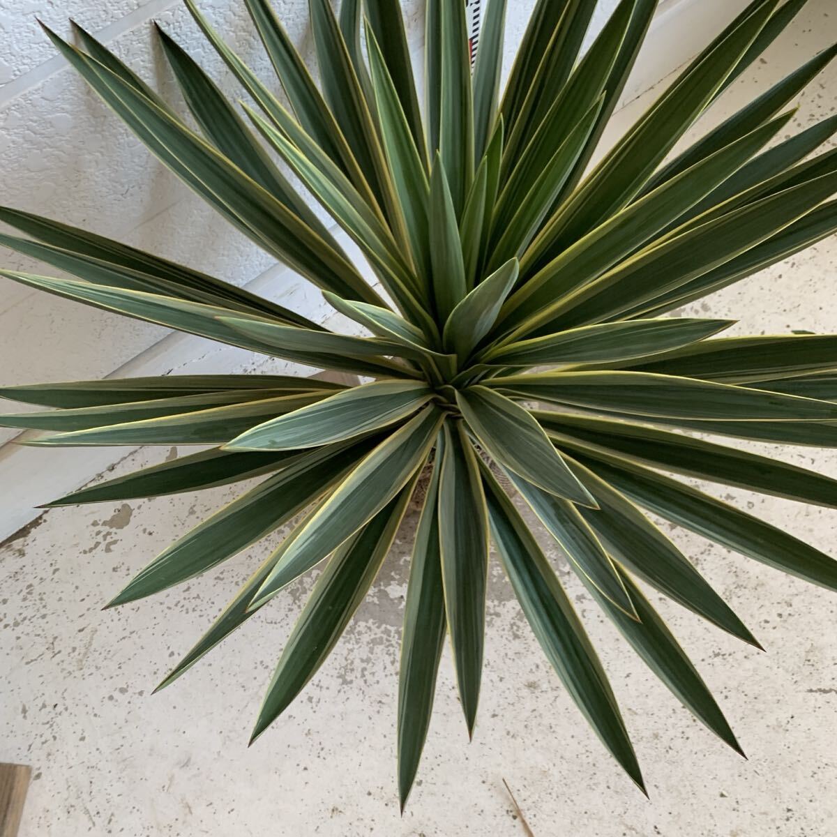 ユッカ・バリエガータは太い幹と上を向いた肉厚のシャープな葉が特徴的。