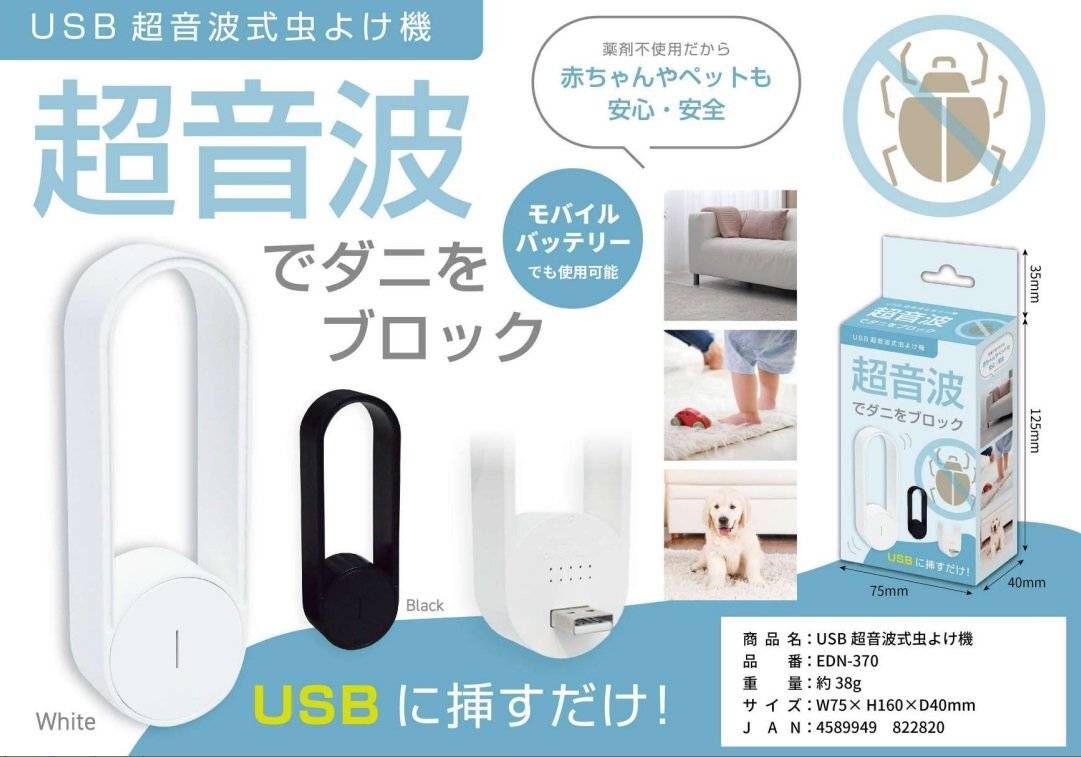 【vaps_3】USB 超音波式 虫よけ機 超音波でダニをブロック ダニ 蚊 ノミ EDN-370(ブラック) 送込 收藏