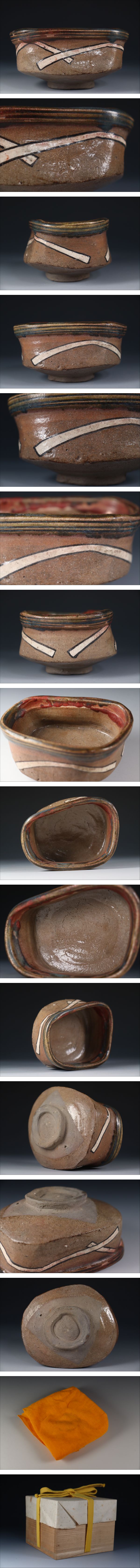 | 商品説明 | 商品名:蔵出し品 古織部 桃山~江戸初期 絵織部 沓形茶碗 付属品:四方桟共箱、布あり。 サイズ:高さ6,8cm、口径13cm、高台5,5cm。 状態:経過のスレ、ニュウがございます。 |