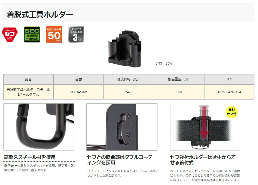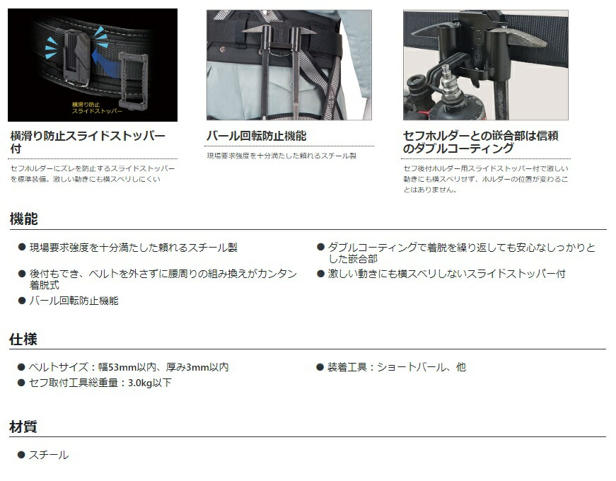 タジマ TAJIMA品番流通コードSFKHI-BM2022製品情報製品重量:260g特長●現場要求強度を十分満たした頼れるスチール製●ダブルコーティングで着脱を繰り返しても安心なしっかりとした嵌合部●後付もでき、ベルトを外さずに腰周りの組み換えがカンタン着脱式●激しい動きにも横スベリしないスライドストッパー付仕様●ベルトサイズ:幅53mm以内、厚み3mm以内●セフ取付工具総重量:3.0kg以下●装着工具:ボルシンM20・M22材質●スチール