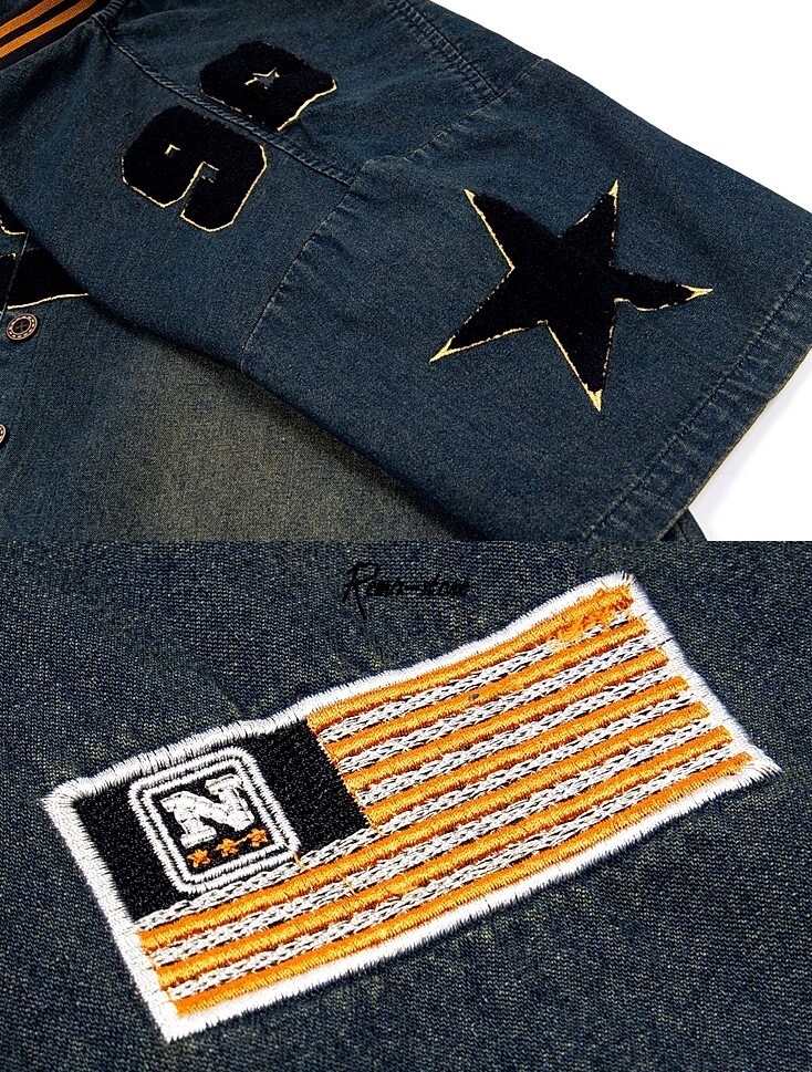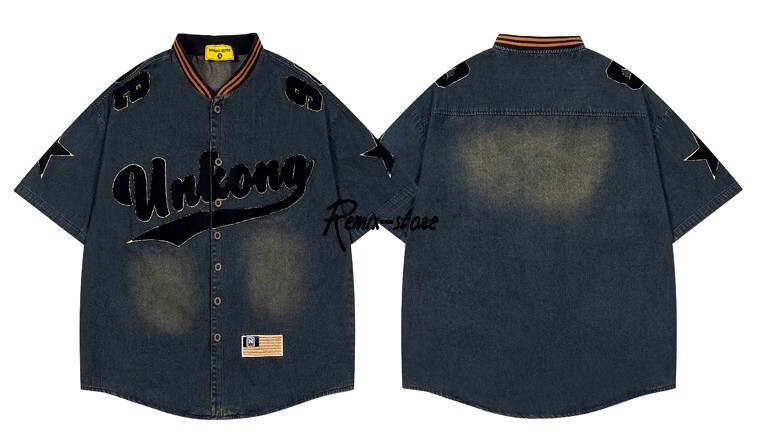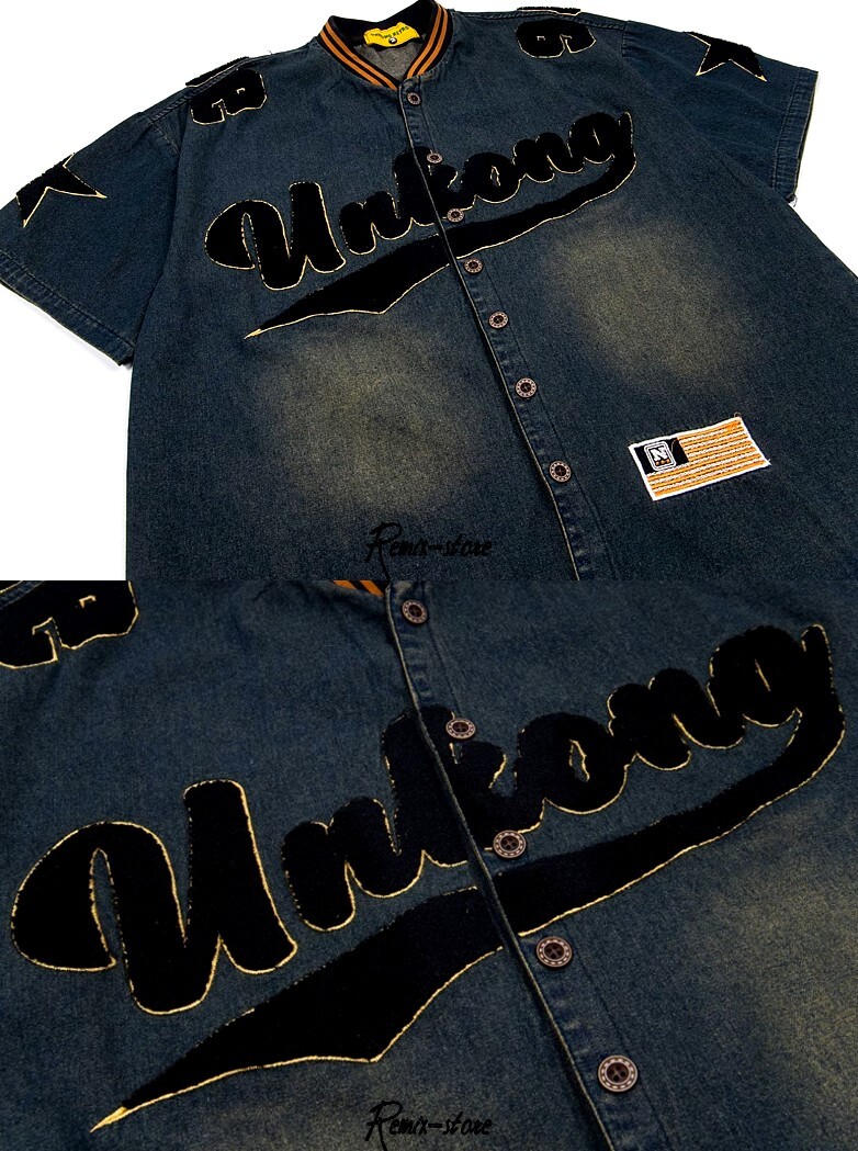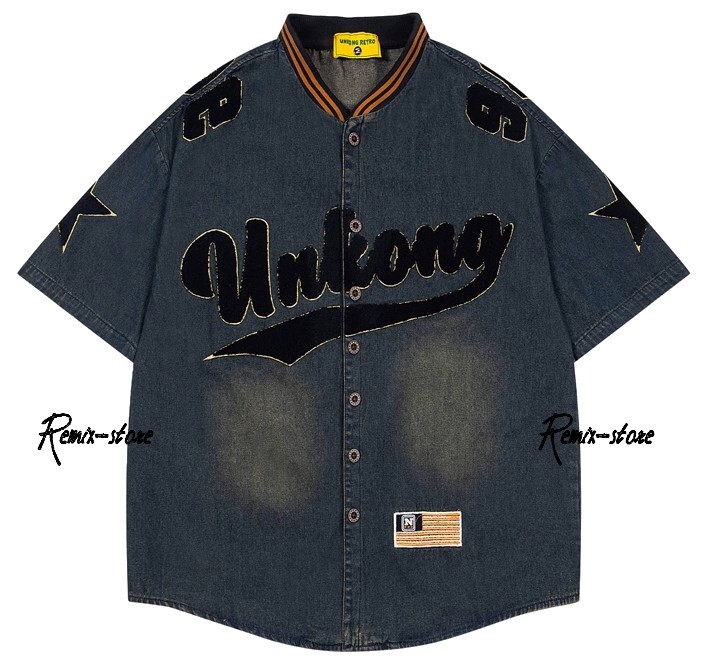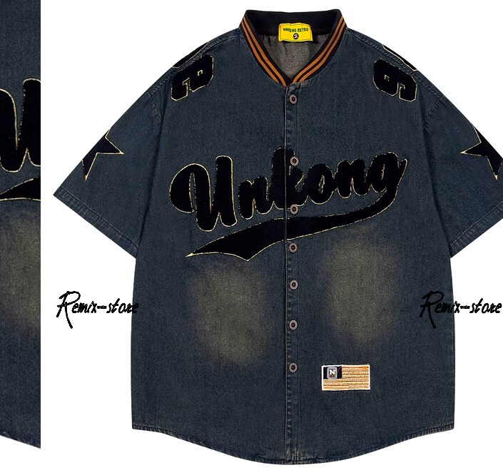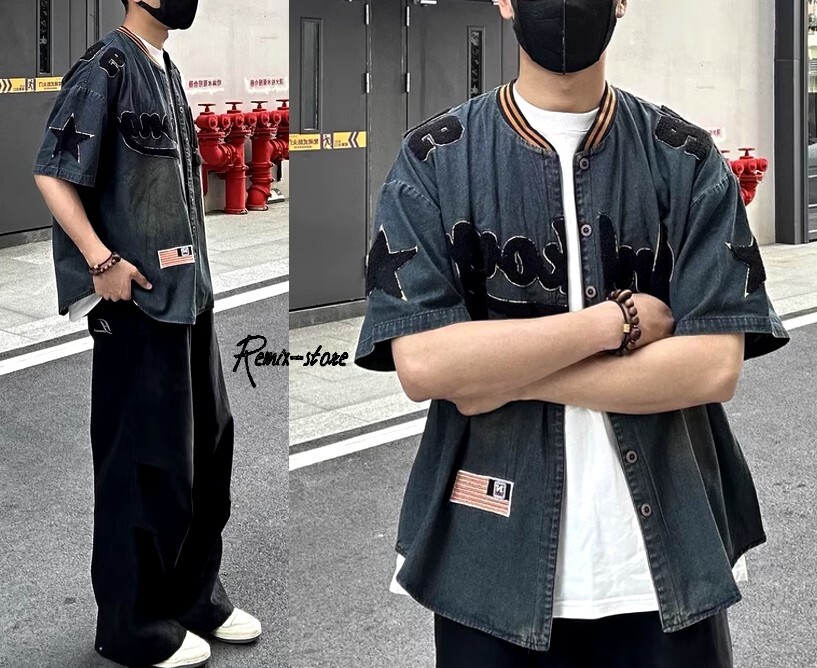 ★SUMMER ワッペン アメカジ ブリーチ デニム ベースボールシャツ 半袖 スタジャン メンズ レディース M〜XL オーバーサイズ★sw517 收藏
