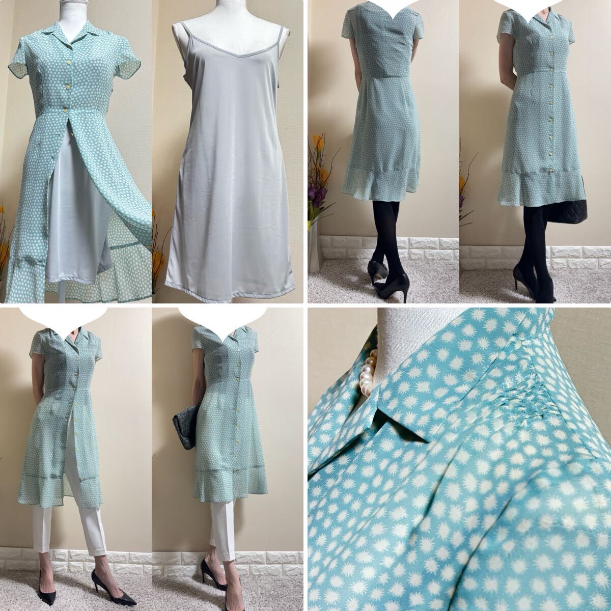 美品!コムサ コムサデモード COMME CA DU MODE 上質 ジョーゼットワンピース インナー付 9 SM エメラルドグリーン 総柄 半袖 收藏
