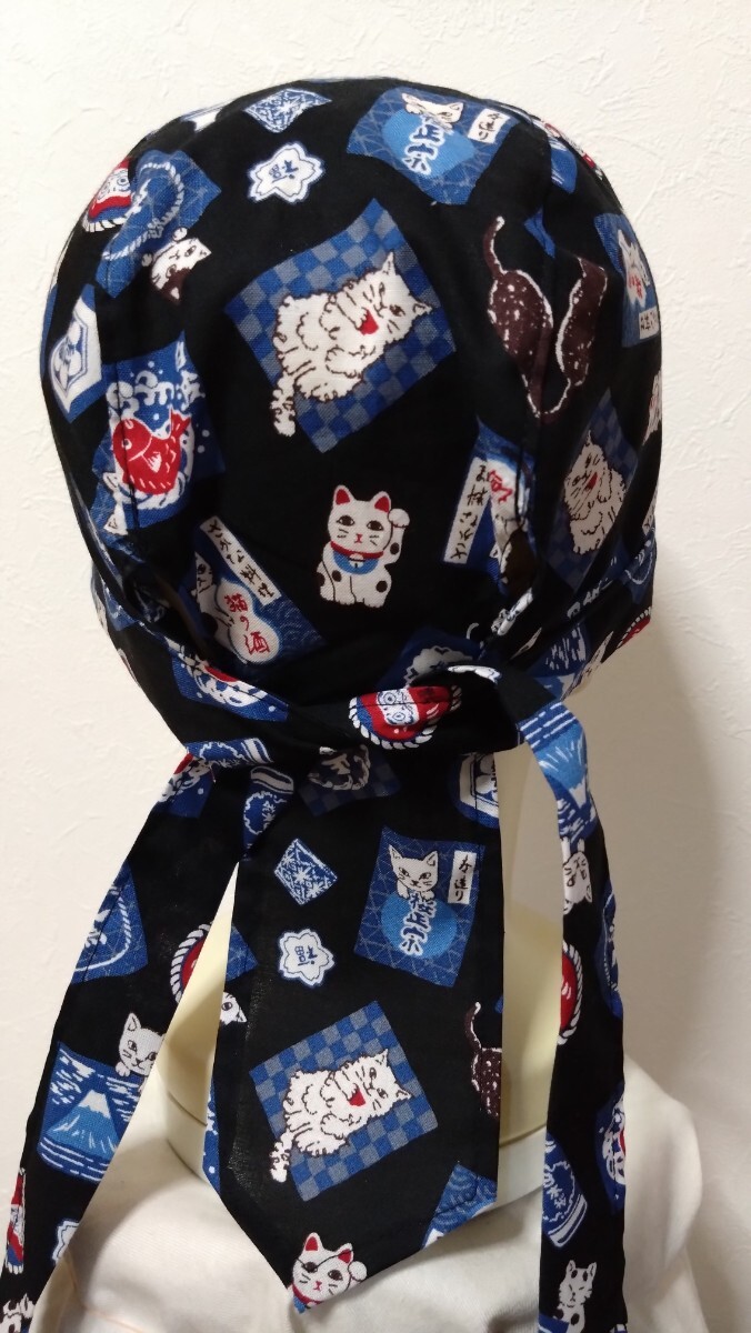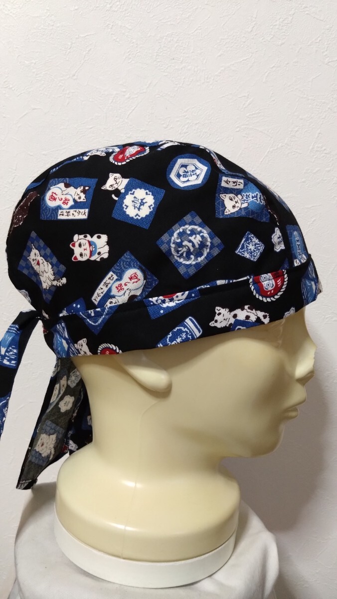 ★バンダナキャップ★ハンドメイド 和柄 酒屋の看板 ダルマ 日本酒 ネコ 黒 收藏