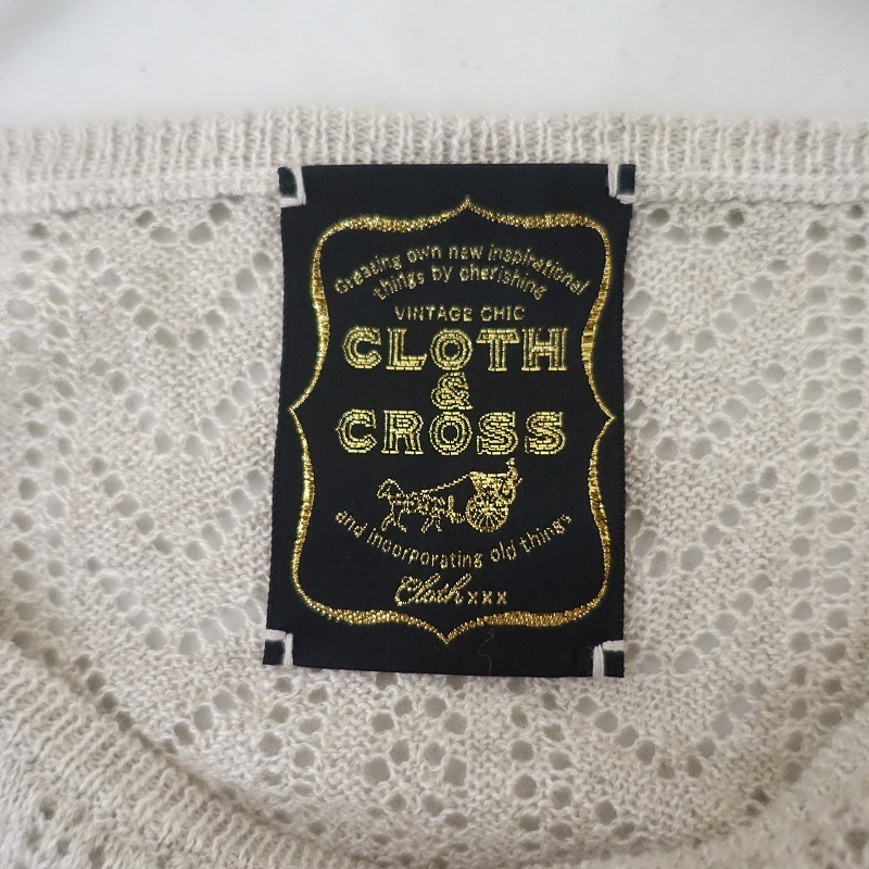 | Cloth&Crossのリネンコットン透かし編みボーダーニットプルオーバーです。カラーはベージュ、ネイビーのボーダーで、透かし編みが施されたニット素材で仕立てられています。プルオーバータイプの着脱です。 |