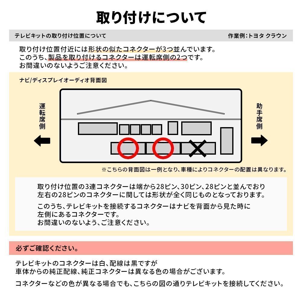 |  走行中でもテレビが見れる&ナビ操作ができるキット こんなお悩みございませんか? ↓↓↓ せっかくナビを買ったのに… 「車が走り出したらテレビ・DVDが見れない!」 「長い渋滞で同乗者がいらいら」 「長距離ドライブで子供がぐずる」 「だけどナビ操作もしたい!」 当店のテレビキットを取り付ければ解決! ↓↓↓ 走行中でもテレビ・DVDが見れる! もちろんナビ操作も可能です! ※本製品は同乗者の方の使用を目的としている商品です。 運転者が画面を凝視することは安全運転義務違反になりますので、絶対におやめください。 また、走行中のナビ操作は助手席の方が行ってください。 「難しい配線加工はわからない…」 ↓↓↓ 当店のテレビキットは 「カチッとはめるだけ」の 完全カプラーオンタイプ! 当店のテレビキットは分割なしの完全カプラーオン! カプラー分解、組み換えなど必要ありません。 簡易説明書付きで簡単に取り付けることができます。 ※取付の際は万が一のため、バッテリーの接続を外すなどのうえ、作業してください。   テレビナビキットを取り付けても法律はもちろん、車検にも合格します。 ナビゲーションの通常の機能(バックカメラやETCなど)を損なうことはございません。 また、ナビ操作も可能になりますので、走行中でも目的地設定、ルート変更もできます。 ※地図、自車位置ずれなどの起こりません。 助手席や後部座席の方が走行中にテレビをご覧になるのはもちろん問題ございません。 当製品は走行中に助手席、後部座席の方の利用を目的として販売しているカプラーキットです。 運転者が走行中にモニターを凝視することは安全運転義務違反になり、大変危険ですのでおやめください。 また、走行中のナビ操作も助手席の方が行ってください。 お取り付けに関するサポートは行っておりませんのでご了承ください。 また、取り付けたことにより発生した事故・故障・損害は一切保証できませんので、お取り付けは整備工場などで行い、あくまで自己責任のうちで取り付けを行ってください。 (作業ミスなどの責任は負いかねます)   |