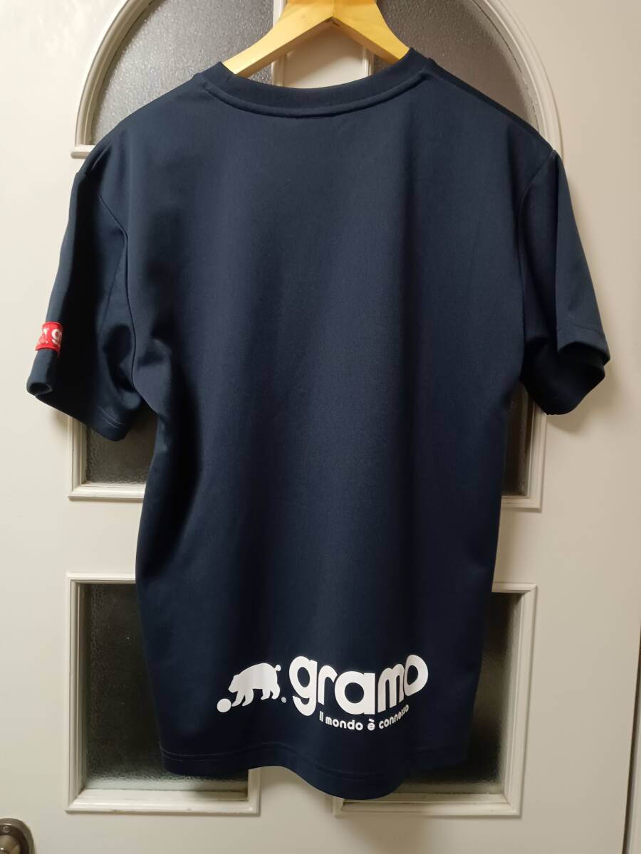 グラモのプラクティスシャツです。お色は濃紺で素材はポリエステル100%です。表示サイズはMで肩幅48、着丈64、身幅53、袖丈21ほどです。素人採寸ですのでご参考程度にお願いします。着用回数が少ないのでコンデションは問題がないと思います
