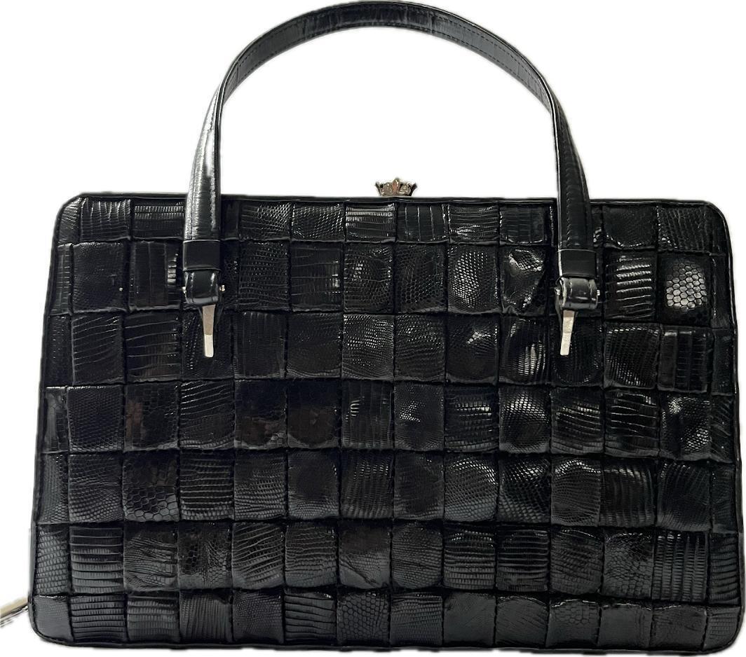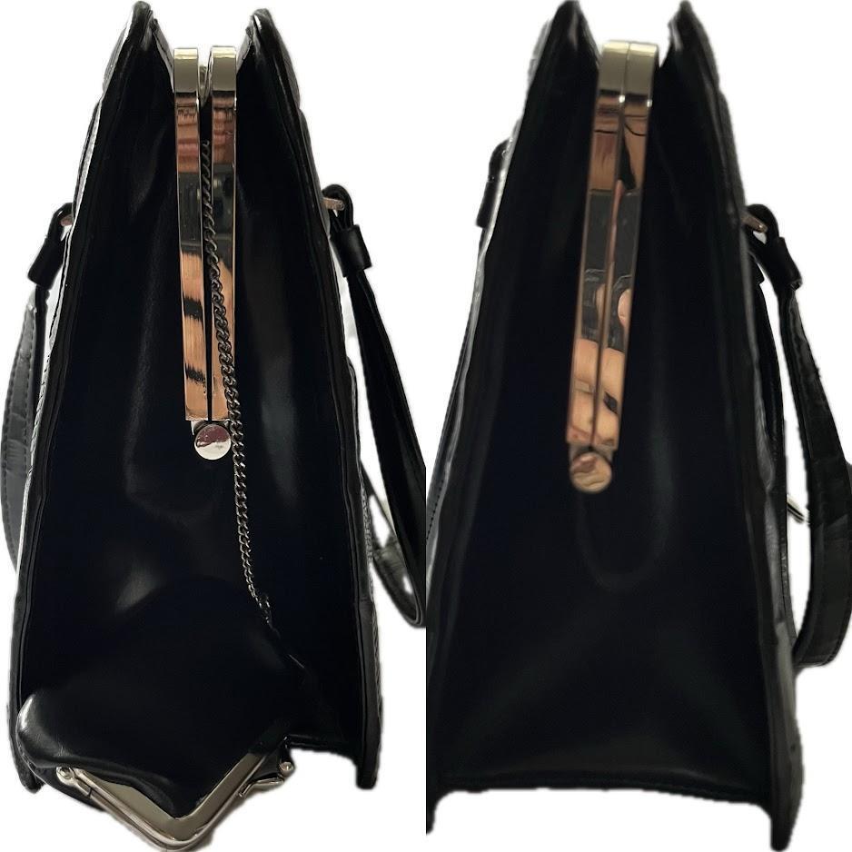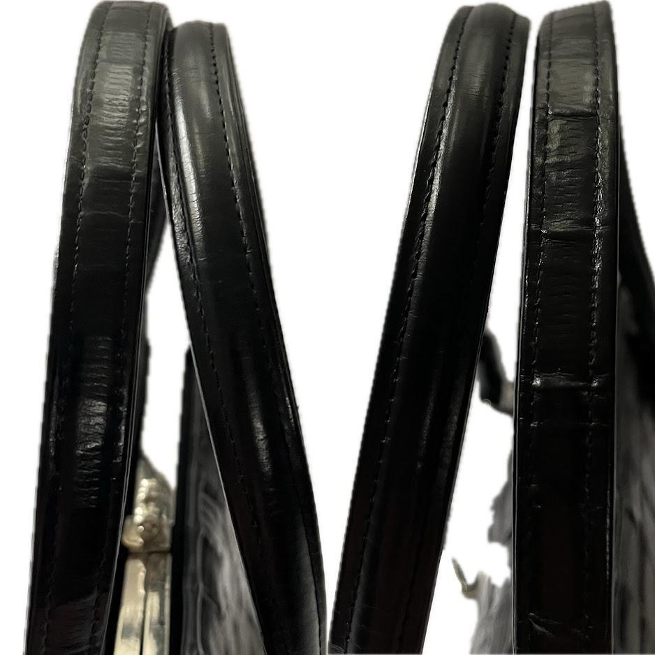 【希少】亀革 タートルレザー エキゾチックレザー ハンドバッグ がま口 昭和レトロ ミニポーチ付 黒 レザー 冠婚葬祭 フォーマル 手提げ 收藏