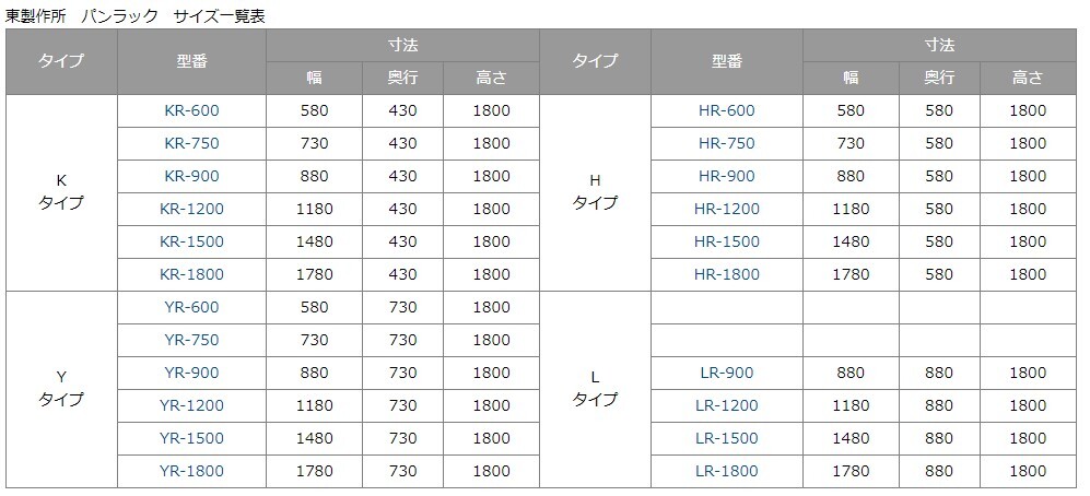 商品名:パンラック W1500×D600×H1800| タイプ | 型番 | 寸法 | タイプ | 型番 | 寸法 | ||||