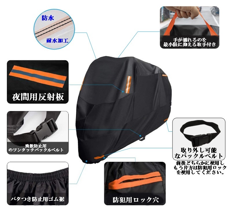 超厚手420D クルーザー級、ビッグスクーター対応 めくれ防止バックル付き 3XL バイクカバー防水 撥水 防犯ロック対応 飛散防止 ブラック 收藏