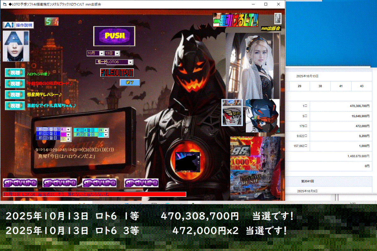 新作[◆LOTO予想ソフトAI搭載機ガンメタルブラックハロウィンLT] 2025年10月10日 ロト7 1等 434,879,400円 当選です!。。!