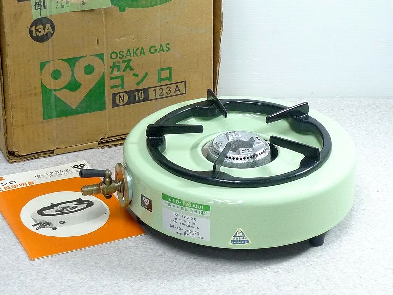 8014E01*10B▲未使用品 大阪ガス ガスコンロ 10-123A型 グリーン 緑 都市ガス用 昭和レトロ キッチン 卓上コンロ 箱付 收藏